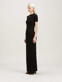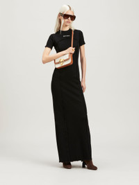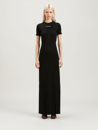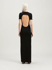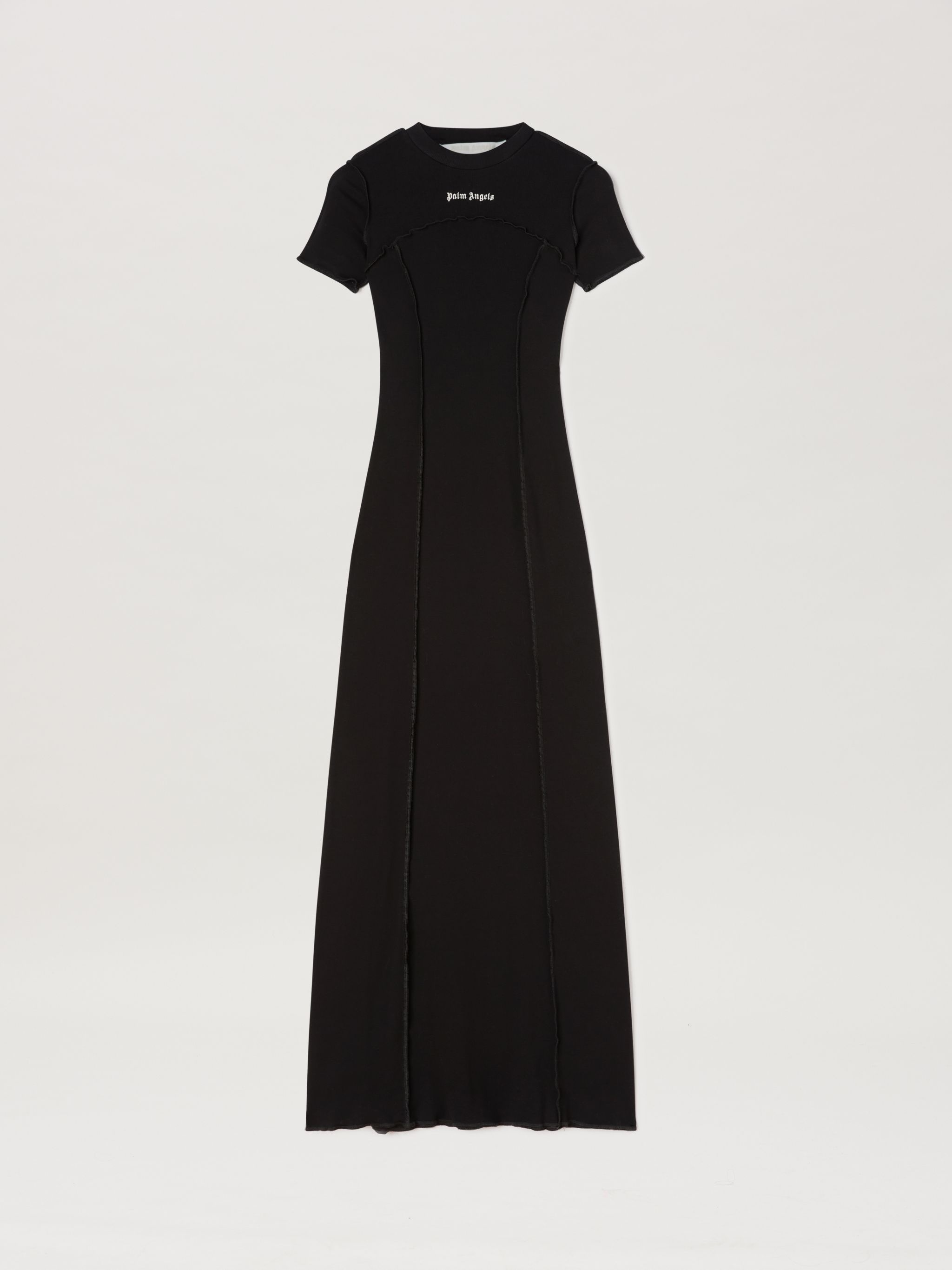 Women's long black ribbed dress with short sleeves, open back, and Palm Angels logo printed in white under the collar. FABRIC 93% COTTON 7% ELASTAN EMBROIDERY 100% POLYESTER MODEL ERIKA WEARS SIZE S HEIGHT: 5'7" (175 CM) BUST: 31" (79 CM) WAIST: 23" (58 CM) HIPS: 34" (86 CM) PRODUCT ID: PWDH002F23FAB0021003