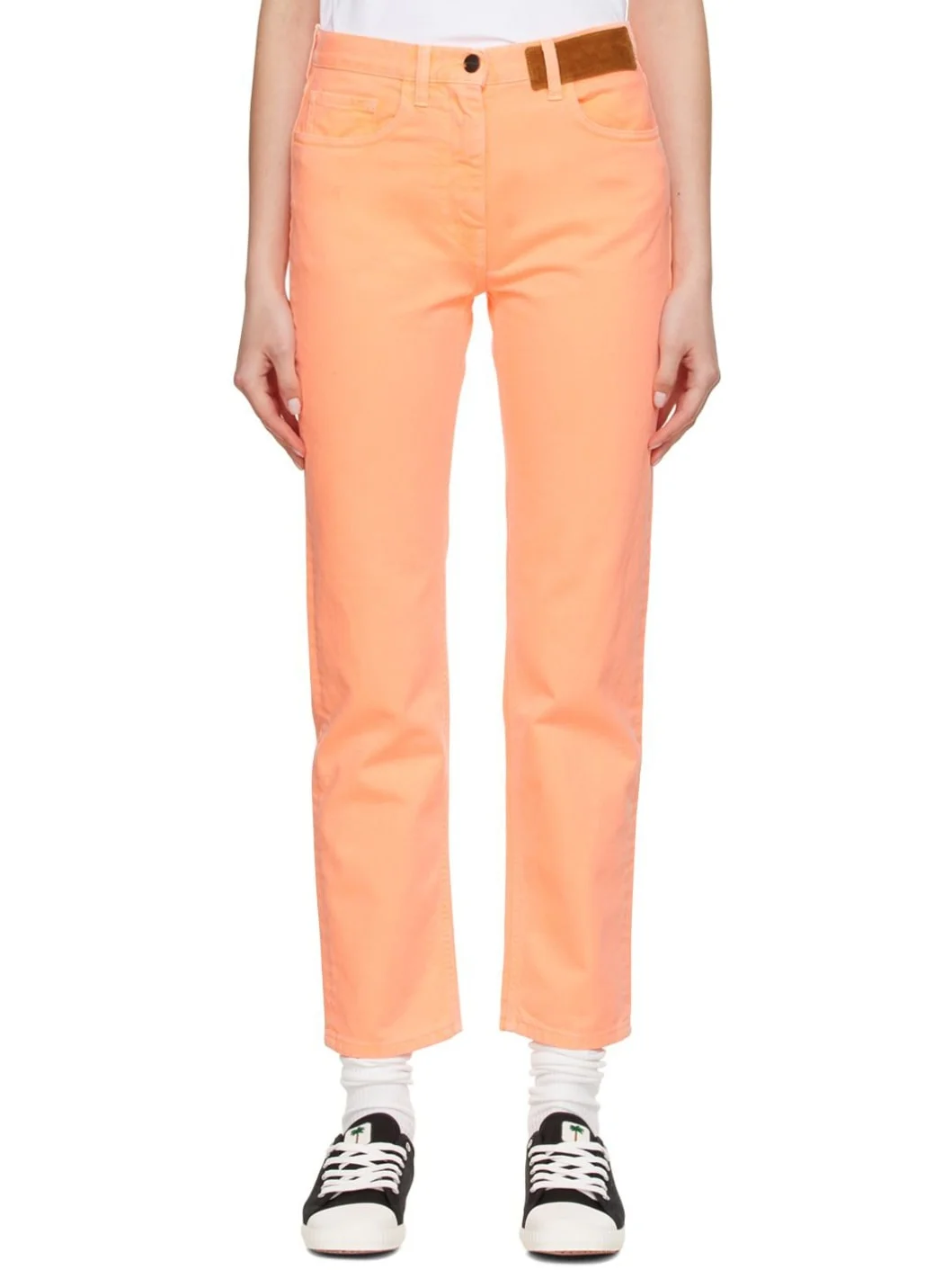Non-stretch denim jeans. Fading throughout. · Belt loops · Suede patch at waistband · Zip-fly · Five-pocket styling Supplier color: Orange fluo/Brown 100% cotton.