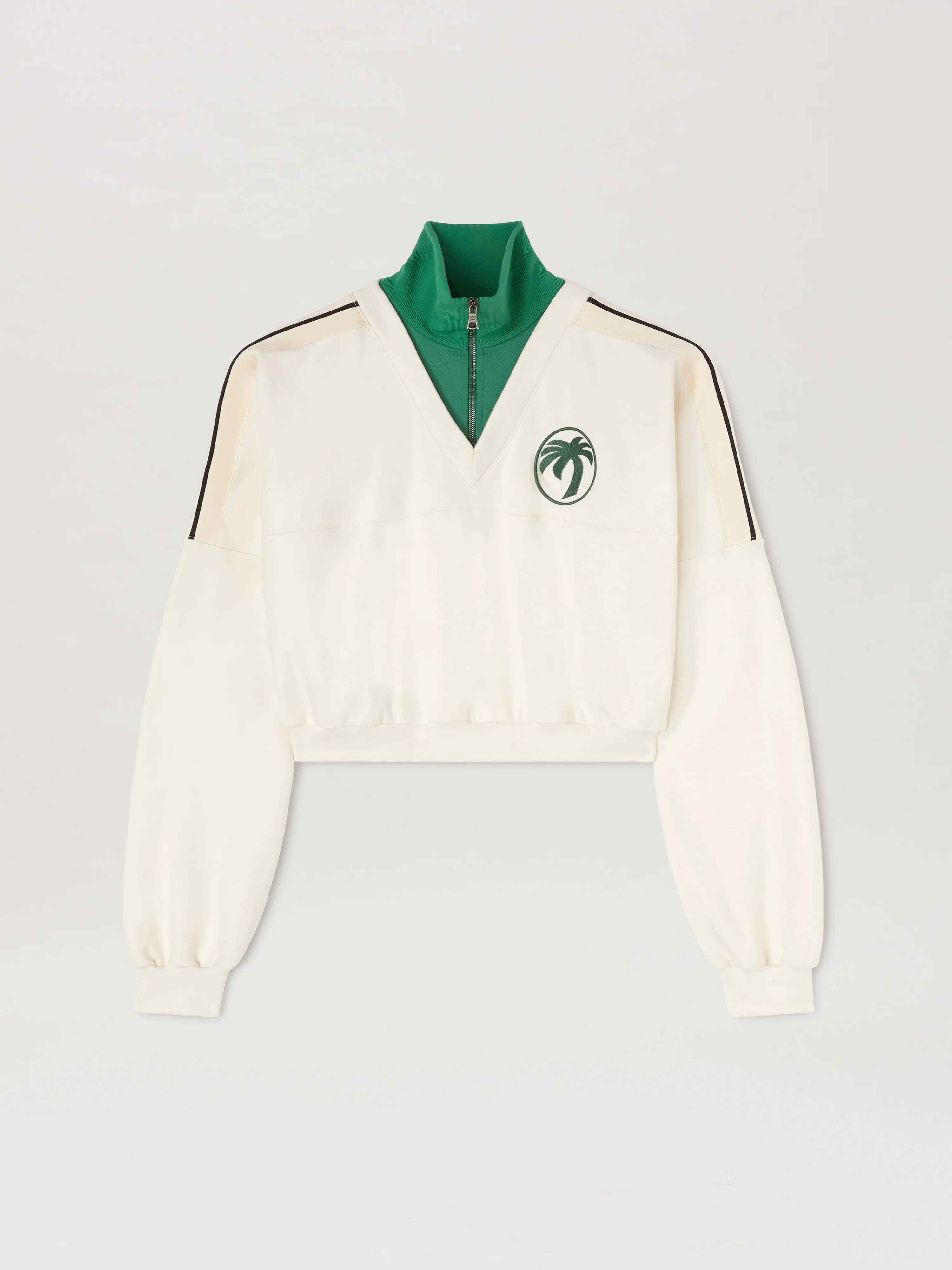 A sport elegance, crowned with a palm crest. Women's white sweatshirt with green zippered collar, elastic hem, iconic Tape on shoulders and Oval Pam embroidered in green on front. DETAILS - Embroidery 100% PolyesterFabric 1 100% CottonFabric 2 100% PolyesterLining 100% PolyesterRib Detail 2 3% Elastan 97% CottonRib Detail 4% Elastan 96% Polyester - Code: PWBA055S25FLE0010357