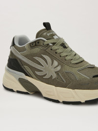 Instantly defining an attitude, blending comfort, style and a calling for a shared identity. Men's leather sneaker with technical fabric inserts, white cushioned high sole, white palm tree stitched on sides, tongue with black leather insert with beige logo and palm tree engraved, white tag with beige Monogram at bottom of lacing and black leather reinforcement with beige palm tree on back. PRODUCT ID: PMIA098S24LEA0010709