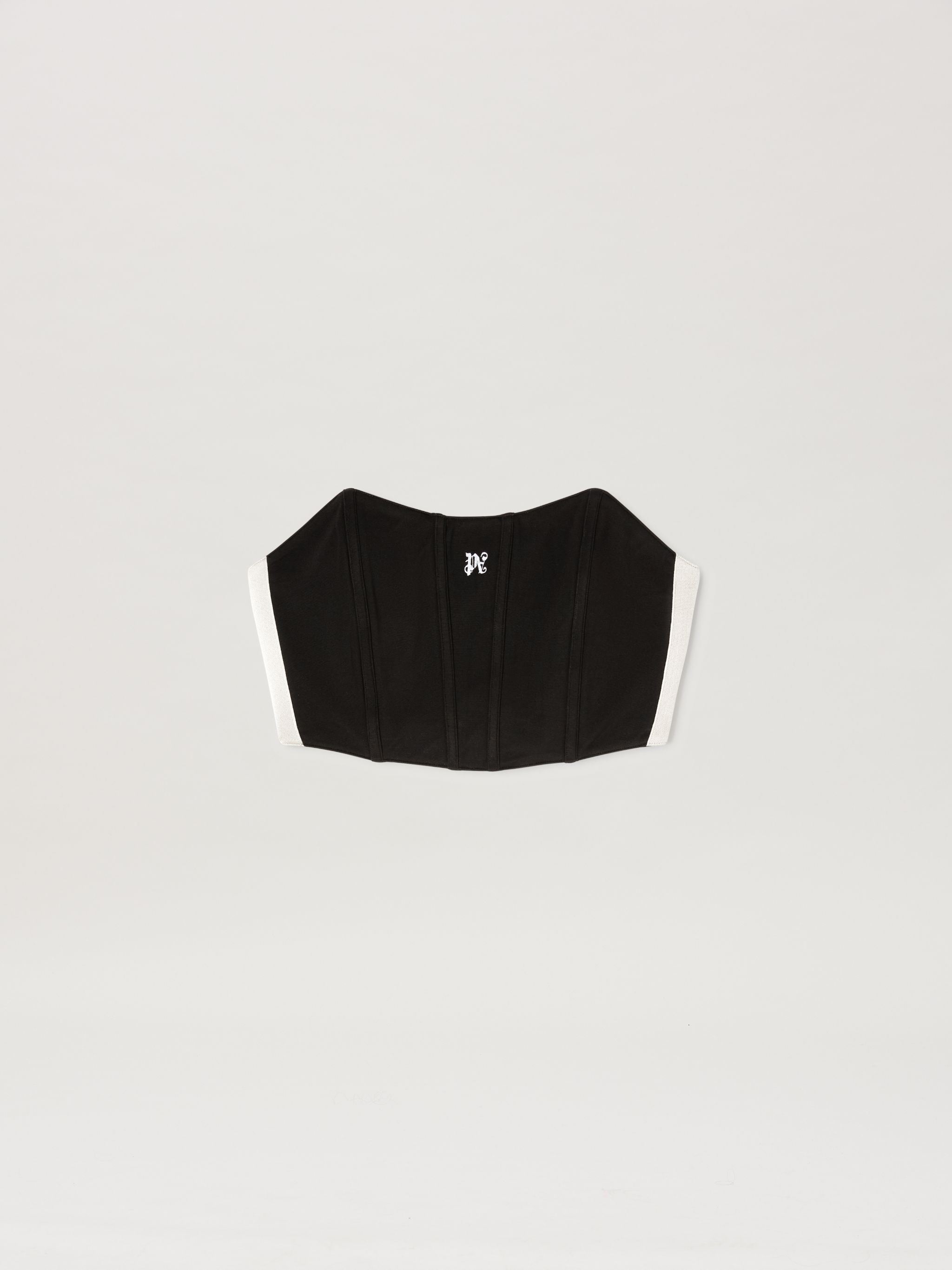 Tracksuit details moved on different garments adding a sophisticated athletic flair. Women's black corset with boning-effect seams on front, ecru band on sides and Monogram embroidered in white on the front. DETAIL 100% POLYESTER - EMBROIDERY 100% POLYESTER - FABRIC 30% POLYAMIDE 70% ACETATE STEFFI WEARS SIZE 40 HEIGHT: 5' 11" (180 CM) BUST: 32" (81 CM) WAIST: 23" (59 CM) HIPS: 35" (89 CM) PRODUCT ID: PWAD069F24FAB0011003