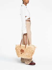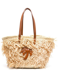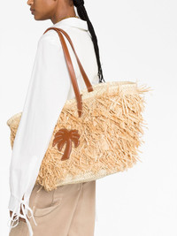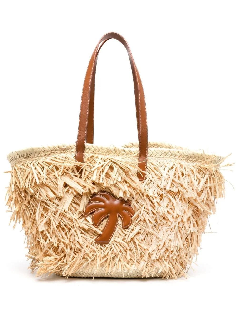 Palm-applique raffia tote bag An apt embodiment of the label’s favourite emblem, this Palm Angels tote is woven from natural raffia with eccentric straw fringing and a namesake tree applique at the front to match the leather top handles. Highlights - Light beige - Raffia - Straw - Leather trim - Palm tree applique - Open top - Two flat top handles - Main compartment Made in Italy Composition Outer: Raffia 100%, Straw 100%, Calf Leather 100% SIZE & FIT Model measurements Height 5 ft 11 in(1.8 m) Bust/Chest 31.49 in(80 cm) Hips 35.82 in(91 cm) Waist 24.8 in(63 cm) Measurement DEPTH 5.9 in(15 cm) HANDLE 11.81 in(30 cm) HEIGHT 11.81 in(30 cm) WIDTH 23.62 in(60 cm)