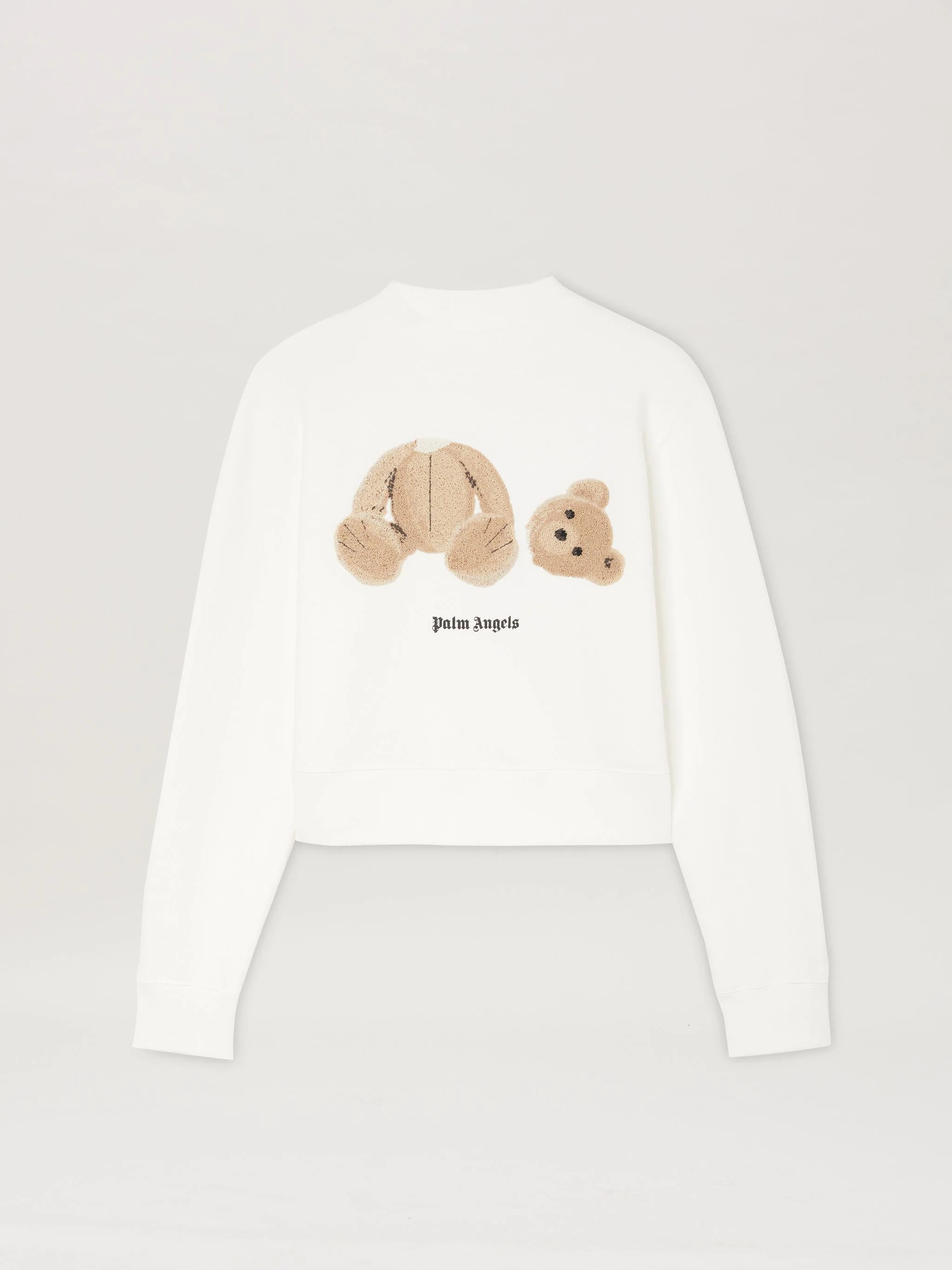 LONG SLEEVES FITTED SWEATSHIRT IN WHITE COTTON WITH BEAR GRAPHIC EMBROIDERED AT FRONT. "PALM ANGELS" LOGO PRINTED IN BLACK AT FRONT. RIB KNIT CUFFS AND HEM. CREWNECK COLLAR. FABRIC 100% COTTON - EMBROIDERY 45% ACRYLIC 45% WOOL 5% COTTON 5% POLYESTER - RIB DETAIL 3% ELASTAN 97% COTTON MODEL MARGHERITA WEARS SIZE S HEIGHT: 5.9" (180 CM) BUST: 30.7” (78 CM) WAIST: 22.8” (58 CM) HIPS: 34.6” (90 CM) PRODUCT ID: PWBA016C99FLE0010160