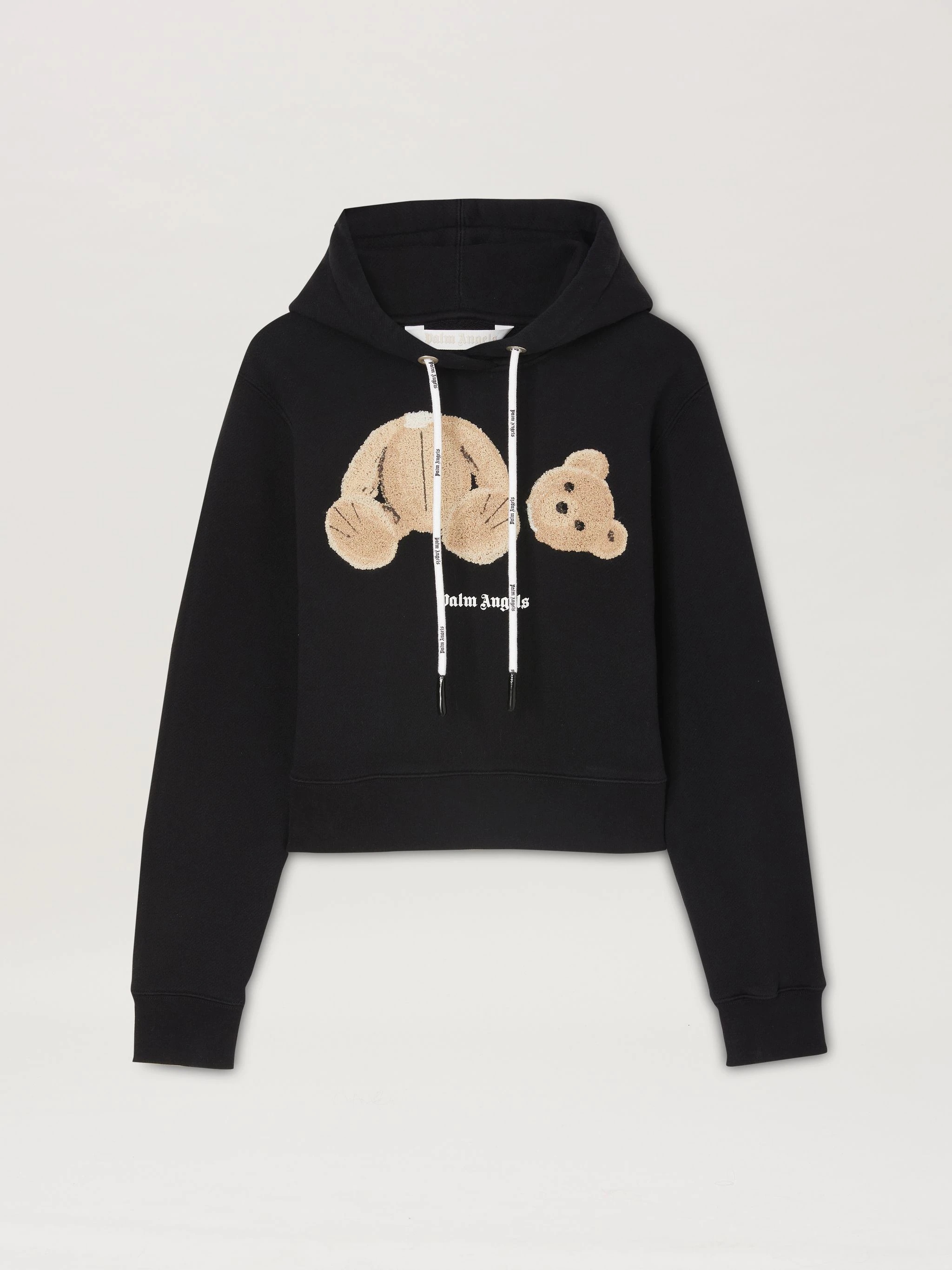 LONG SLEEVES HOODED SWEATSHIRT IN BLACK. BEAR EMBROIDERED ON FRONT. "PALM ANGELS" LOGO PRINTED IN WHITE AT FRONT. WHITE DRAWSTRINGS. MODEL IRENE WEARS SIZE S HEIGHT: 5'.9" (175 CM) BUST: 31" (78 CM) WAIST: 23" (59 CM) HIPS: 35" (88 CM) PRODUCT ID: PWBB023F21FLE0021060