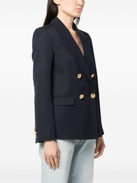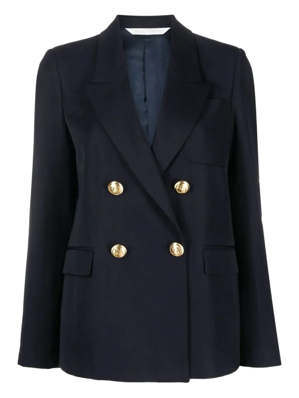 palm-embroidered blazer Palm Angels is known for adding distinct motifs to classic wardrobe staples. This double-breasted blazer is a fine example from the latest collection, taking the brand's iconic palm tree logo and presenting it in a contrasting embroidered iteration. Highlights - Navy blue - Virgin wool blend - Palm tree print - Embossed gold-tone buttons - Peak lapels - Shoulder pads - Long sleeves - Buttoned cuffs - Double-breasted button fastening - Chest patch pocket - Two side flap pockets - Central rear vent - Straight hem Made in Italy Composition Outer: Polyester 55%, Virgin Wool 45% Lining: Cupro 100% Washing instructions Read Manufacturer Guidelines