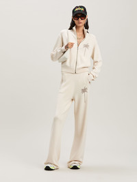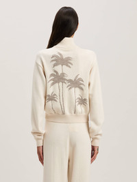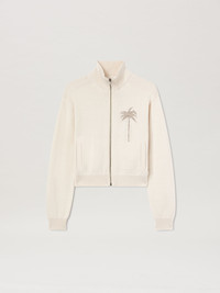 The palm tree, one of the brand's identifying elements, takes center stage for SS25 with new prints, inlays and shapes. Women's white knit track jacket with ribbed detailing, zipper closure, single palm tree inlay in camel on front and camel palm trees inlay on the back. RENDA WEARS SIZE S HEIGHT: 5’ 10” (179 CM) BUST: 30” (77 CM) WAIST: 23” (60 CM) HIPS: 33” (85 CM) PRODUCT ID: PWHA061S25KNI0010362