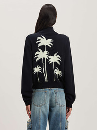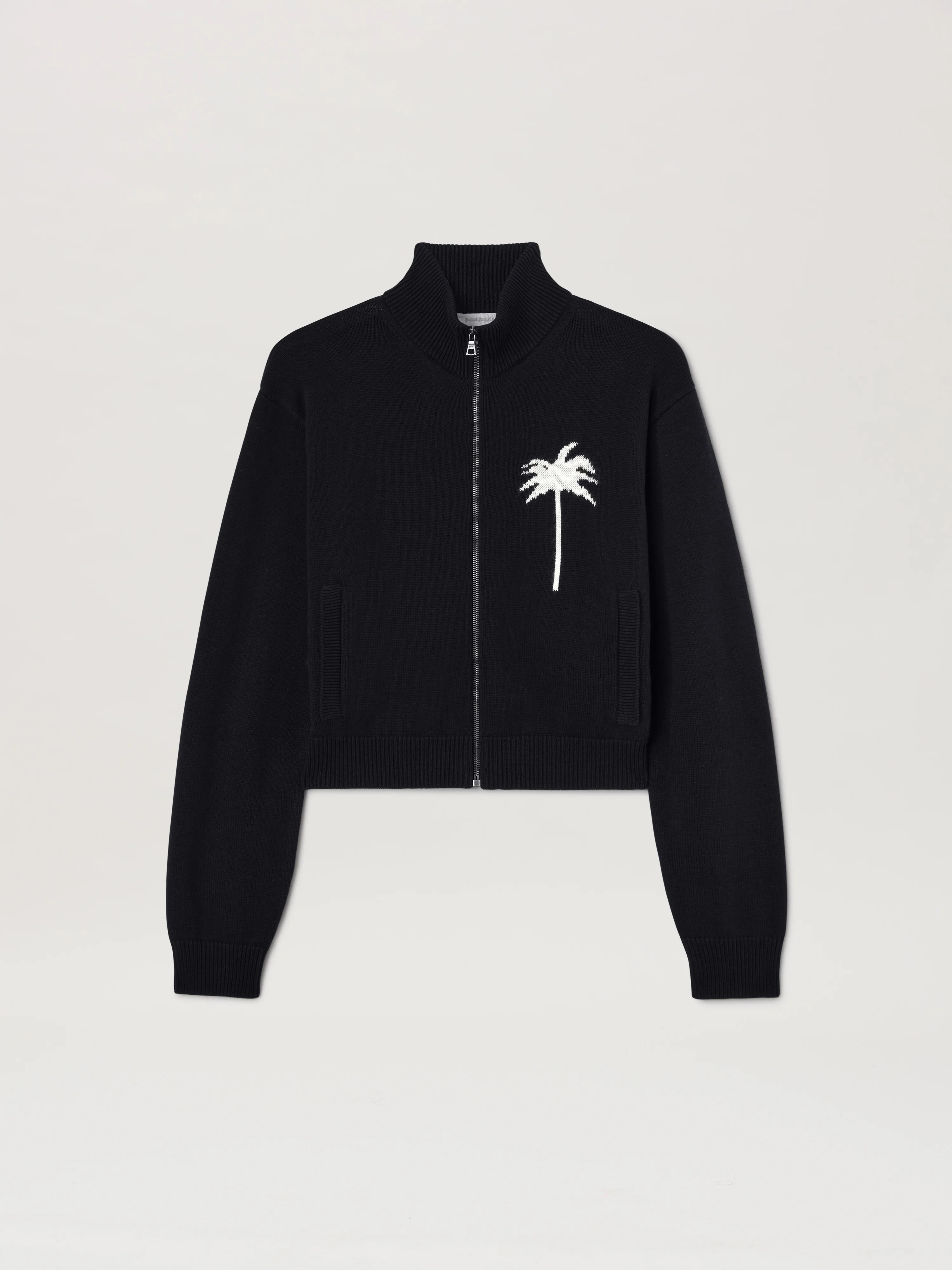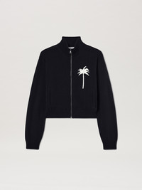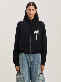The palm tree, one of the brand's identifying elements, takes center stage for SS25 with new prints, inlays and shapes. Women's black knit Track jacket with ribbed detailing, zipper closure, single palm tree inlay in white on front and palm trees inlay in white on the back. DETAILS - Renda Wears Size S Height: 5’ 10” (179 Cm) Bust: 30” (77 Cm) Waist: 23” (60 Cm) Hips: 33” (85 Cm) Fabric 1 40% Lana Merino 60% CottonFabric 2 100% Acrylic - Code: PWHA061S25KNI0011003