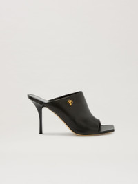 Women's black sabot with open front toe, thin heel and gold palm plaque applied on the band. sole 100% LEATHER upper shoe 100% OVINE LEATHER HEELS: 3.5" (90mm) PRODUCT ID: PWIH020F23LEA0011000
