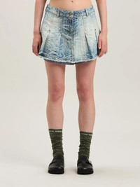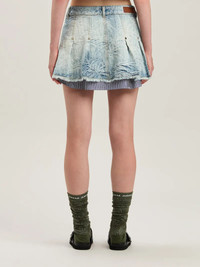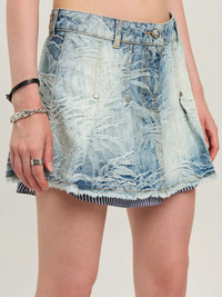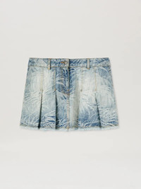 Palm varieties settling on denim and preppy. Women's light blue denim miniskirt with all over white palm trees jacquared pattern and flat pleats fastened by rivets. DETAILS - Detail 100% LeatherFabric 100% Cotton - Code: PWYF019S25DEN0014440