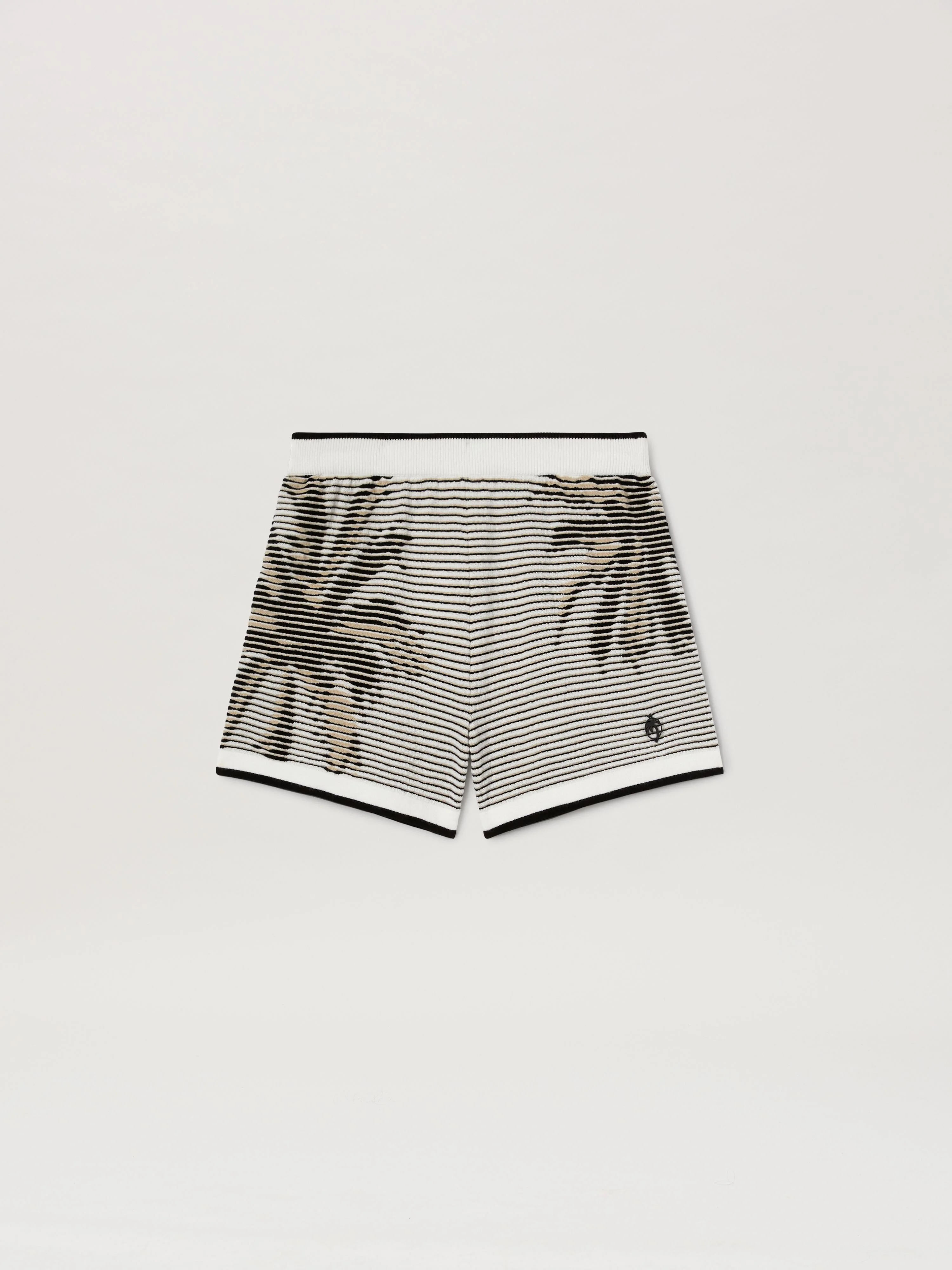 Palm trees blossom in a variety of styles in SS25. Women's knitted shorts with white and black horizontal stripes and pattern of jacquared black palm trees front and back. DETAILS - Fabric 30% Polyester 70% Viscose - Code: PWHM016S25KNI0010310