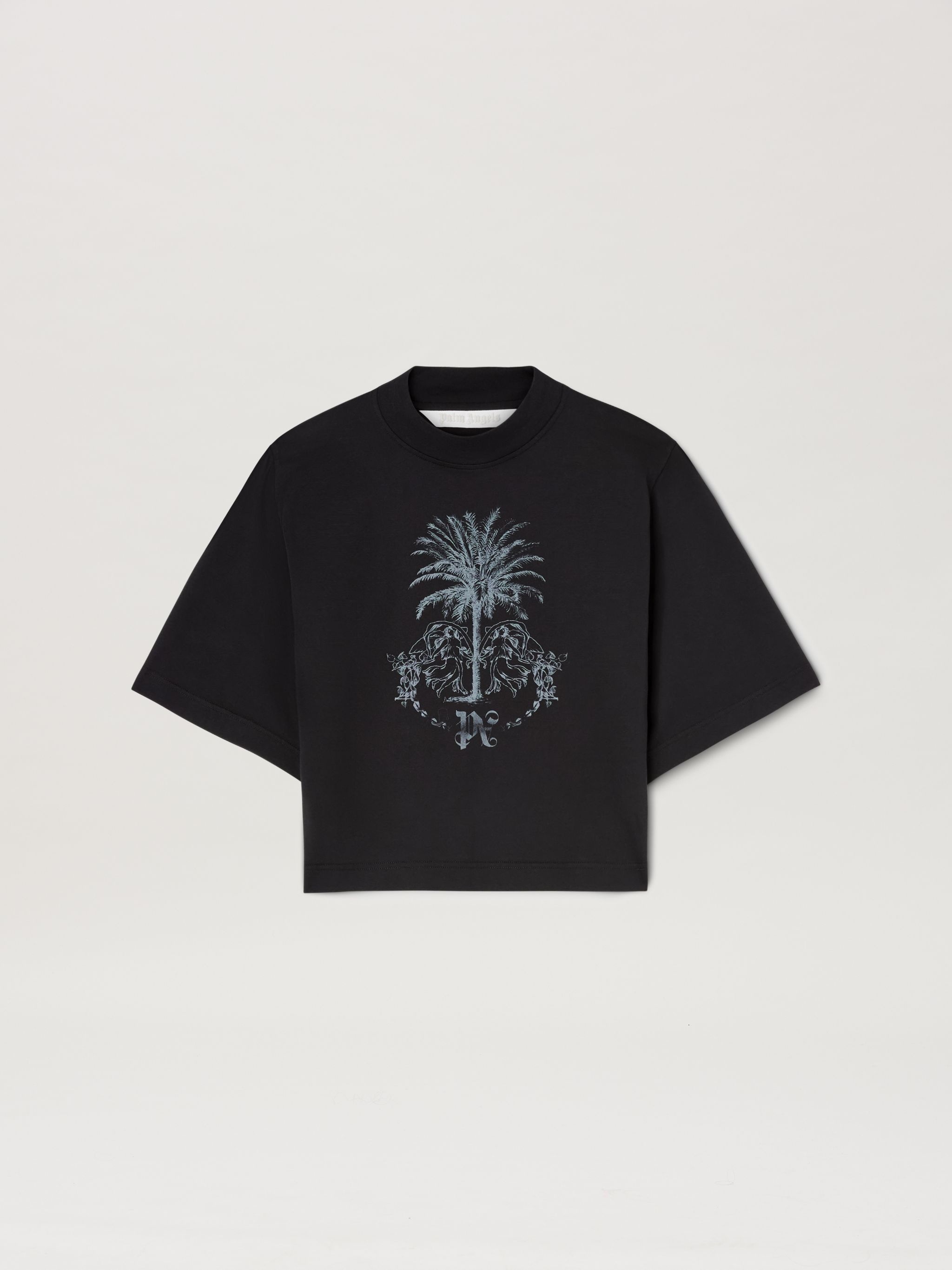 Themes from own imaginary crafted with a pencil-like effect print. Women's black cropped T-shirt with short sleeves, feautering palm trees and Monogram in a pencil-effect printed in grey on the front. Ebba wears size S Height: 5' 10" (178 cm) Bust: 31" (79 cm) Waist: 23" (60 cm) Hips: 35" (89 cm) PRODUCT ID: PWAA020F24JER0071009