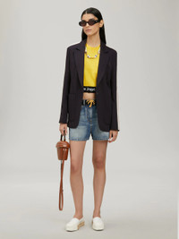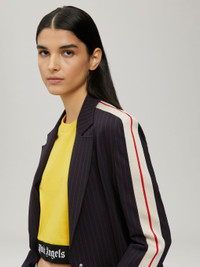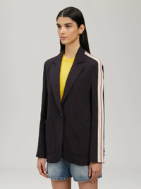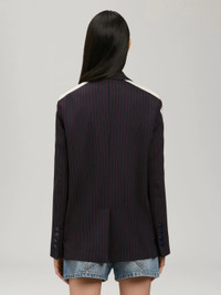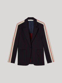 PINSTRIPE BLAZER IN NAVY BLUE FEATURING RED STRIPES. TWO-POCKET AT FRONT. WHITE STRIPES AT SIDE. SPREAD COLLAR. BUTTON CLOSURE. FABRIC 65% VISCOSE 30% POLYAMIDE 5% ELASTAN MODEL PAULA WEARS SIZE 40 HEIGHT: 5'8 (177 CM) BUST: 32" (81 CM) WAIST: 24" (60 CM) HIPS: 35" (89 CM) PRODUCT ID: PWEN013S22FAB0014625
