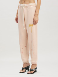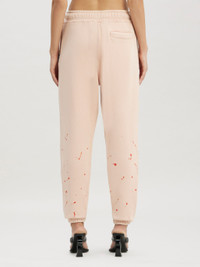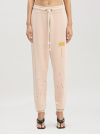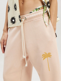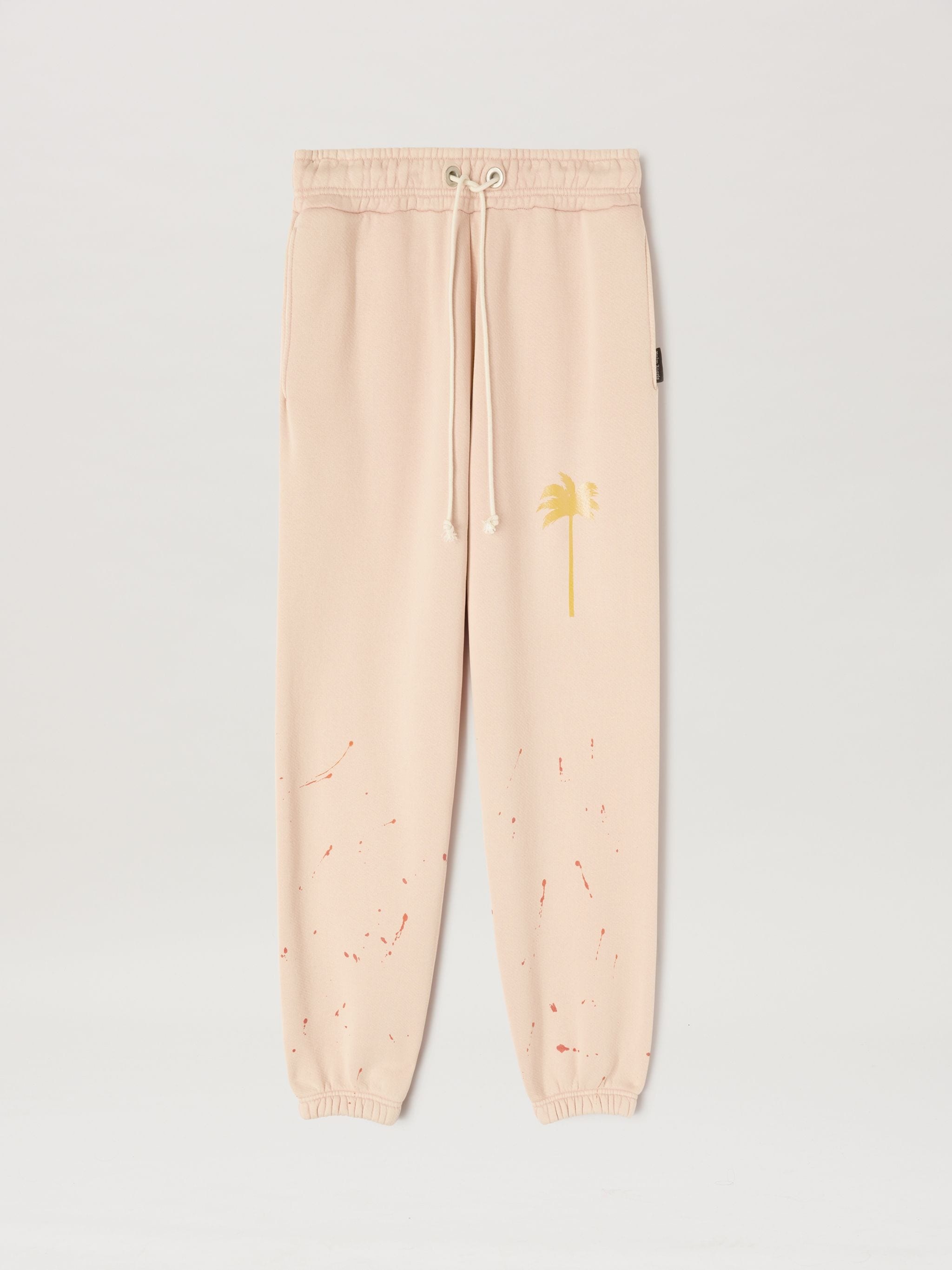 LONG COTTON SWEATPANTS IN CORAL MOCK WITH HANDMADE DRIPPING. THIS PARTICULAR PROCEDURE MAKES EACH GARMENT LOOKS DIFFERENT, THESE DISTINGUISHING FEATURES ARE AN EFFECT THAT MAKE THIS GARMENT UNIQUE AND ARE NOT TO BE CONSIDERED FLAWS. YELLOW PALM TREE LOGO PRINTED AT FRONT. ELASTICIZED WAISTBAND AND ANKLE CUFFS. SIDE AND BACK POCKETS. WHITE DRAWSTRINGS. FABRIC 100% COTTON - DETAIL 100% POLYESTER - RIB DETAIL 95% COTTON 5% ELASTAN MODEL IVANA WEARS SIZE S HEIGHT: 5’9" (179 CM) CHEST: 33" (85 CM) WAIST: 24" (61 CM) HIPS: 34" (87 CM) PRODUCT ID: PWCH006S23FLE0013322