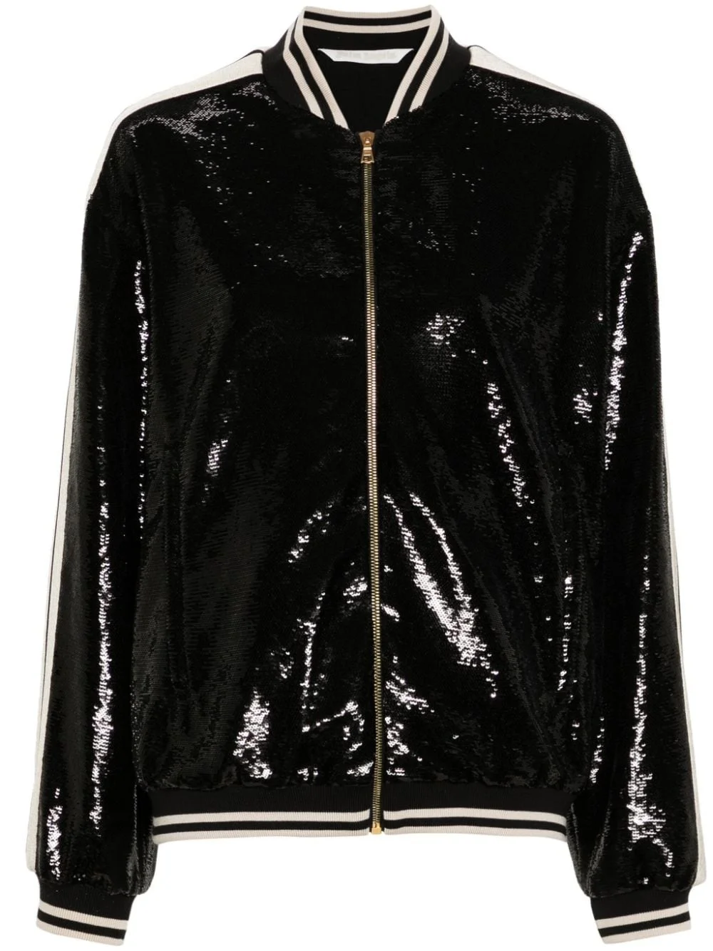 sequinned bomber jacket Highlights - Black/white - Sequin embellishment - Front zip fastening - Stripe trim - Baseball collar - Side stripe detailing - Long sleeves - Ribbed cuffs and hem - Two side zip-fastening pockets - Embroidered palm trees to the rear - Satin lining - Straight hem Made in Italy Composition Lining: Cupro 100% Outer: Polyester 100% SIZE & FIT Model measurements Height 5 ft 11 in(1.8 m) Bust/Chest 33.07 in(84 cm) Hips 37.4 in(95 cm) Waist 25.19 in(64 cm) FittingInformation Designed to be unstructured, offering a loose fit throughout The ribbed hem offers a close, comfortable fit Made from a midweight non-stretch fabric