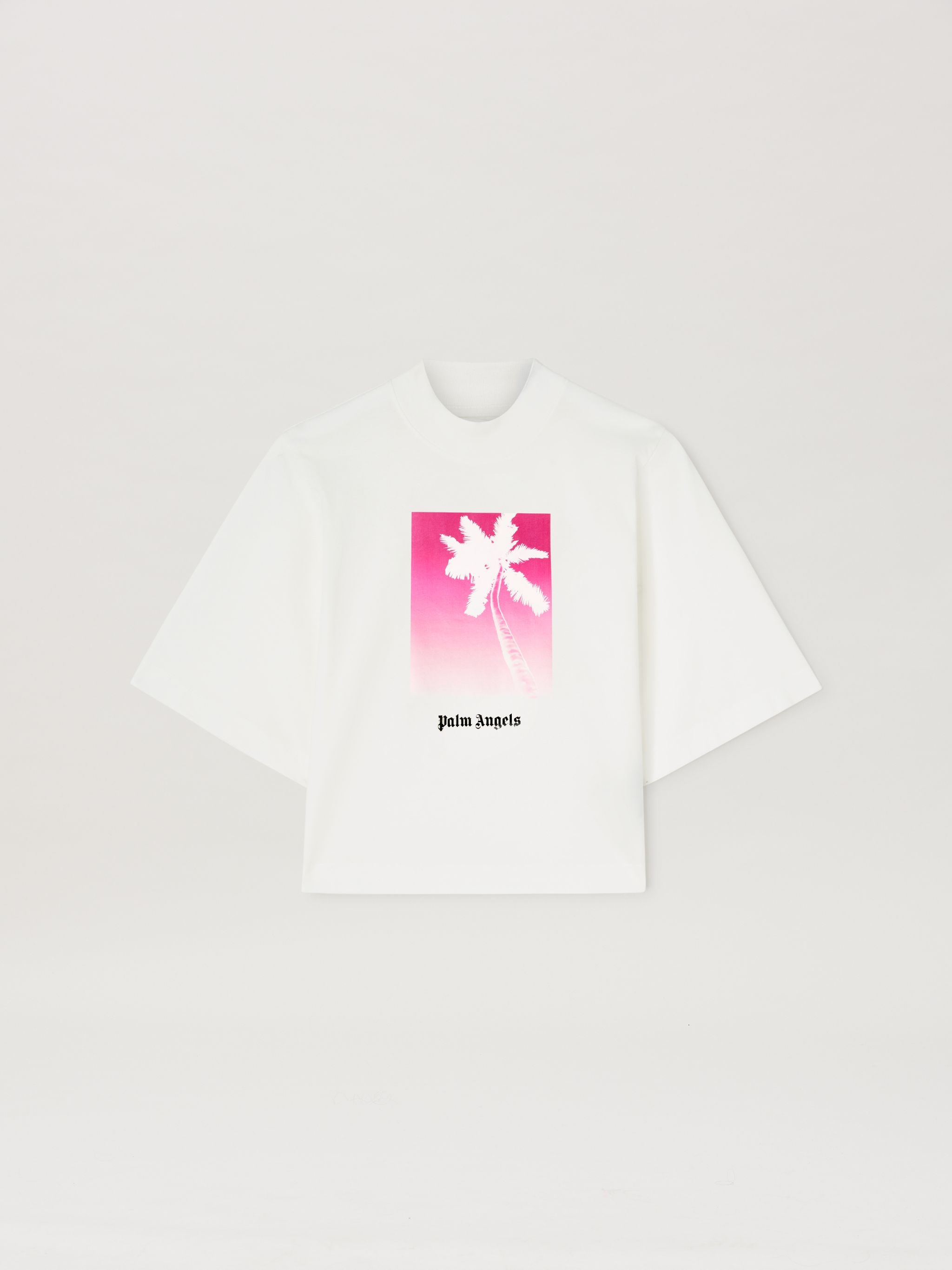 Mixing shore and street vibes on a classic of leisure time. Women's oversize white cropped T-shirt with fucshia solarized print of a palm tree and logo Palm Angels in black printed underneath. LAURE WEARS SIZE S HEIGHT: 5' 9" (177 CM) BUST: 30" (78 CM) WAIST: 23" (60 CM) HIPS: 35" (87 CM) PRODUCT ID: PWAA020F24JER0060332