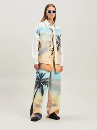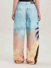 Snapshot of summer 2025 in one of the collection's most iconic prints. Women's 5-pocket denim pants with baggy fit, featuring black palm trees printed on a pastel sunrise background on front and back. DETAILS - Detail 100% LeatherFabric 100% CottonLining 100% Cotton - Code: PWYB040S25DEN0018410