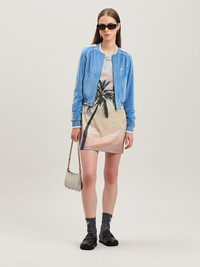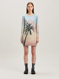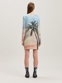 Snapshot of summer 2025 in one of the collection's most iconic prints. Women's long-sleeved dress with black palm tree on pastel-colored sunrise background printed on stretched lurex jersey. DETAILS - Fabric 15% Elastan 76% Polyester 9% PolyamideLining 100% Polyester - Code: PWDB256S25FAB0018410