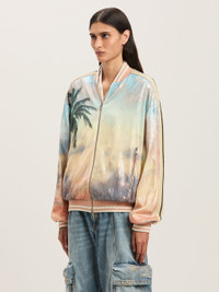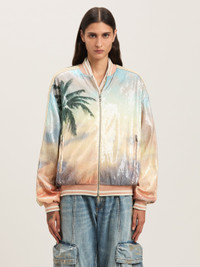 Snapshot of summer 2025 in one of the collection's most iconic prints. Women's bomber with black palm tree printed on pastel-colored sunrise background all coverd by sequins. PRODUCT ID: PWEH024S25FAB0018410