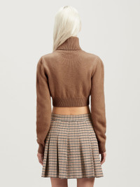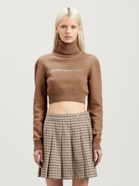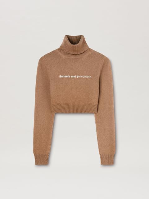Women's camel color knitted turtleneck sweater with ribbed hem and collar, featuring a quote and Palm Angels logo embroidered on the front in white. FABRIC 40% LANA MERINO 30% VISCOSE 20% POLYAMIDE 10% CASHEMERE EMBROIDERY 82% POLYESTER 18% METALLIZED FIBER MODEL ERIKA WEARS SIZE S HEIGHT: 5'7" (175 CM) BUST: 31" (79 CM) WAIST: 23" (58 CM) HIPS: 34" (86 CM) PRODUCT ID: PWHF024F23KNI0016210