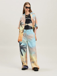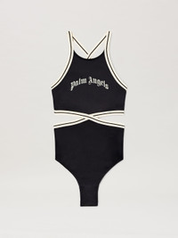 The Iconic Tape reaches for water. Women's black swimsuit with front cuts and Iconic tape piping, criss cross laces on the back and Curved logo printed in white on front. PRODUCT ID: PWFC014S25FAB0011003