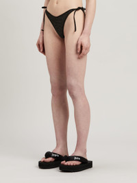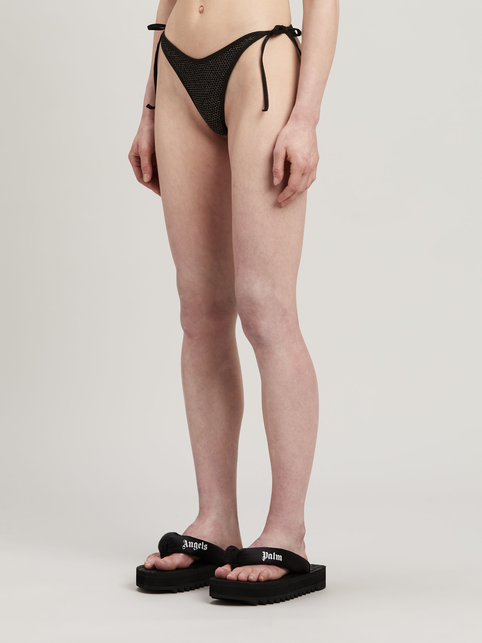 Women's black lurex V-leg bikini bottom with hip ties and small golden chain with Monogram on the back. Viktoria wears size S Height: 5' 7½" (171 cm) Bust: 32½" (82 cm) Waist: 23" (58 cm) Hips: 34½" (88 cm) PRODUCT ID: PWFG007S24FAB0031076