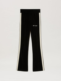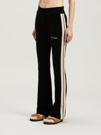 Women's black velvet tracksuit pants with ecru side bands with black thread, flared cut and, exclusive new feature for the fall winter 2023 collection, Palm Angels logo fully embroidered in white on the front left. FABRIC 80% COTTON 18% POLYAMIDE 2% ELASTAN EMBROIDERY 100% POLYESTER DETAIL 100% POLYESTER MODEL ERIKA WEARS SIZE S HEIGHT: 5'7" (175 CM) BUST: 31" (79 CM) WAIST: 23" (58 CM) HIPS: 34" (86 CM) PRODUCT ID: PWCJ019F23FAB0021003