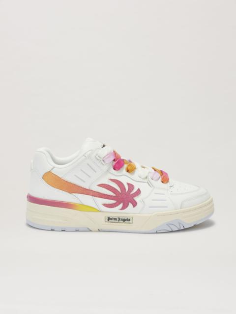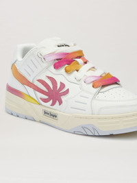 Patchwork of materials and colors that open up new destinations for a sporty accessory. White leather sneaker with leather inserts in gradient colors from orange to fuchsia, multi-color laces, elongated palm tree in gradient colors stitched to the sides, and Palm Angels logo in black on the sole. PRODUCT ID: PWIA065F24LEA0030184