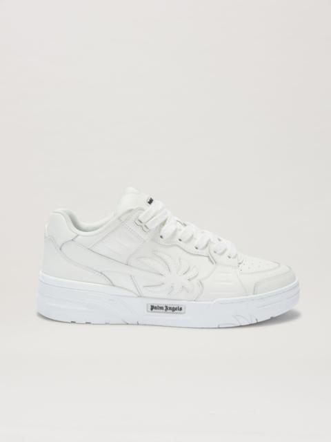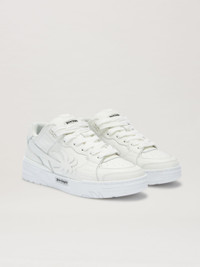 Monochromatic elegance for the most street style of shoes. White leather sneaker with perforations on the front, elongated palm stitched on the sides and Palm Angels logo in black on the sole. PRODUCT ID: PWIA065F24LEA0010101