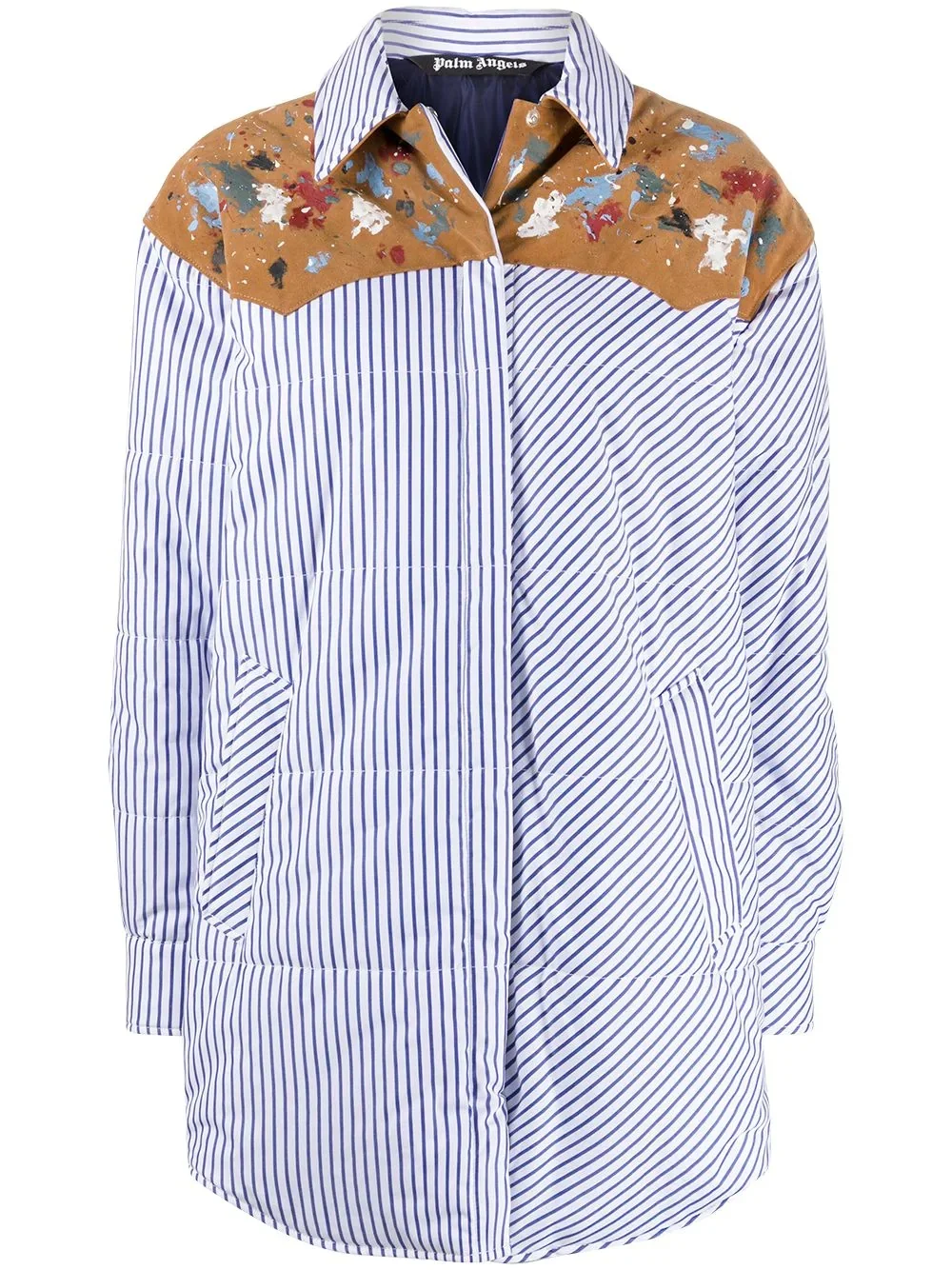 vertical-stripe padded shirt jacket Some people have to earn their stripes. Not you, though. All you have to do is throw on this Palm Angels striped shirt jacket and you're good to go. Easy, peasy. Highlights - Blue/white/brown - Padded - Vertical stripe pattern - Suede insert with multicoloured paint splatters - Detachable suede belt - Classic collar - Concealed front button fastening - Long sleeves - Two side slit pockets - Buttoned cuffs - Curved hem Made in Italy Composition Suede 100%, Polyamide 100%, Polyester 100% SIZE & FIT Model measurements Height 5 ft 10 in(1.78 m) Bust/Chest 31.49 in(80 cm) Hips 37 in(94 cm) Waist 23.62 in(60 cm) FittingInformation This piece fits true to size. We recommend you get your regular size Cut for a loose fit. Comes with an adjustable belt for a flexible fit at the waist Made with a mid-weight non-stretch fabric Washing instructions Dry Clean Only