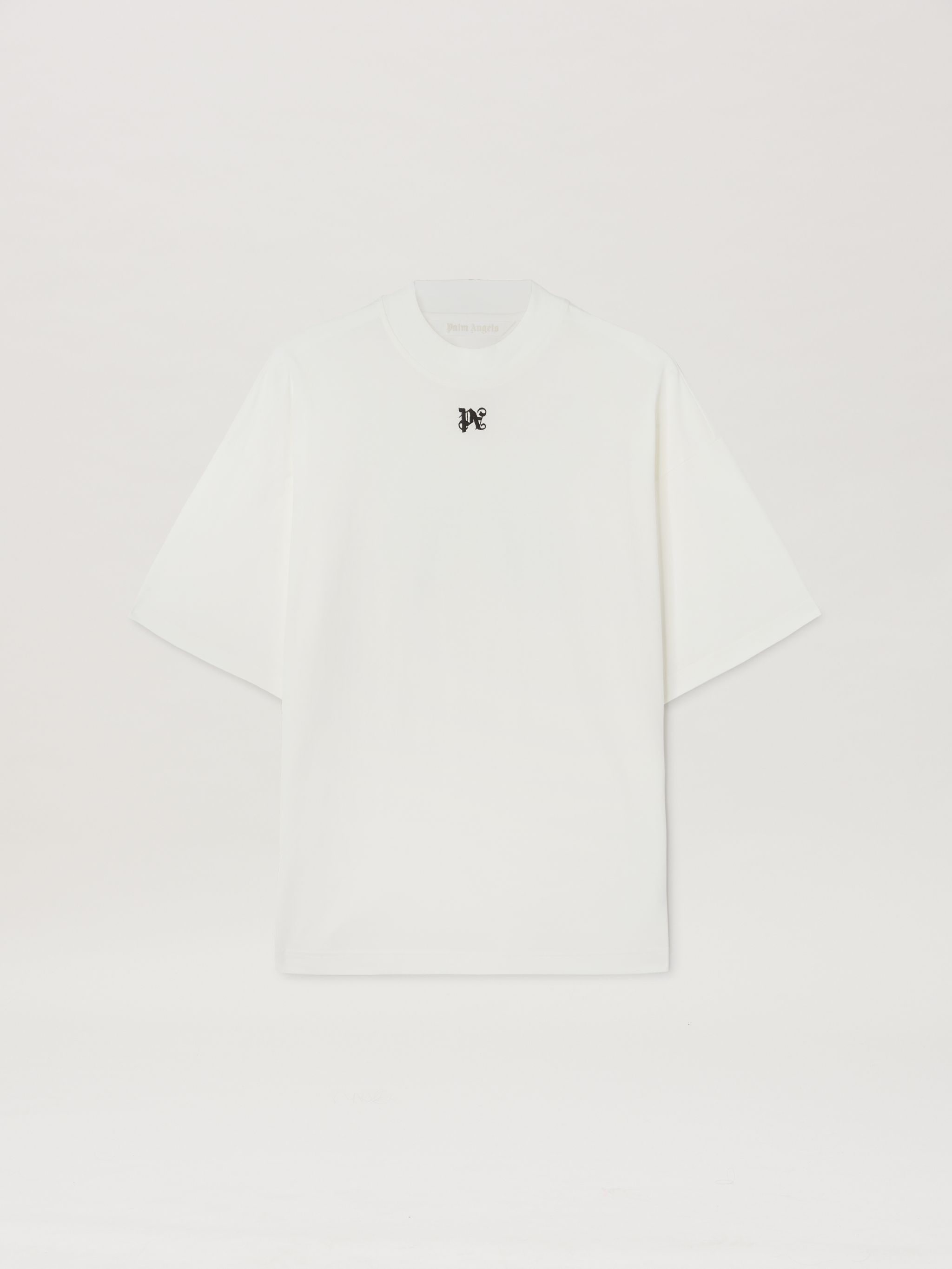 Themes from own imaginary crafted with a pencil-like effect print. Women's white T-shirt with over fit and short sleeves, feautering black Monogram printed on front and pencil-effect wings printed on the back. PRODUCT ID: PWAA017F24JER0040310