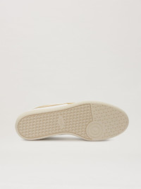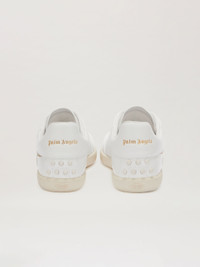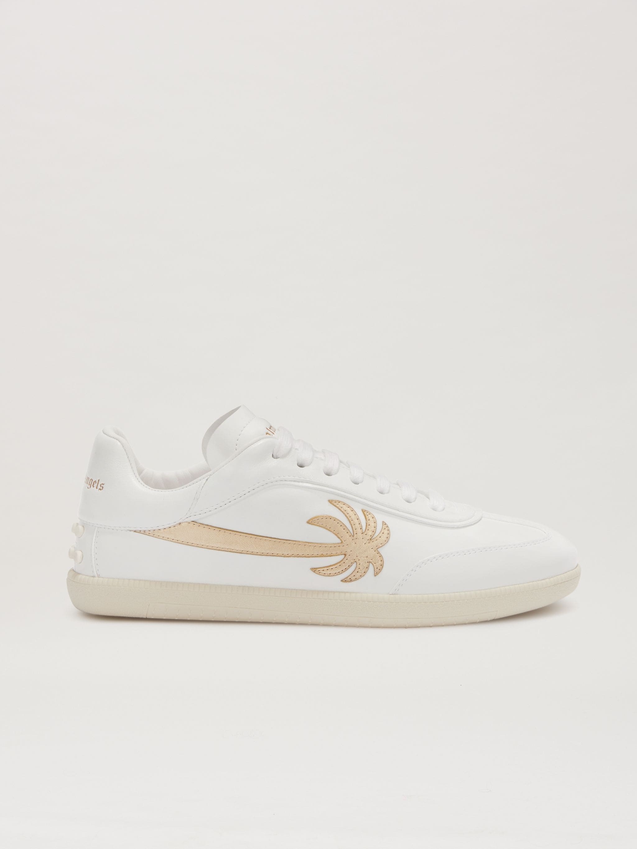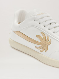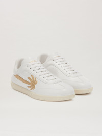 Overcoming the boundaries between functionality and aesthetics, in a perfect synthesis of elegance and nonchalance, exclusively for the FW23 collection, Palm Angels collaborates with Tod's, playing with one of the brand's distinctive elements, the Gommino. A white leather sneaker with tapered line, gold leather patch in the shape of an elongated palm sewn on the upper and distinctive rubber pebble motif on the back with Tod's logo engraved on the sole and Palm Angels logo printed in gold on the ankle and tongue. PRODUCT ID: PWIA059F23MAT0010176
