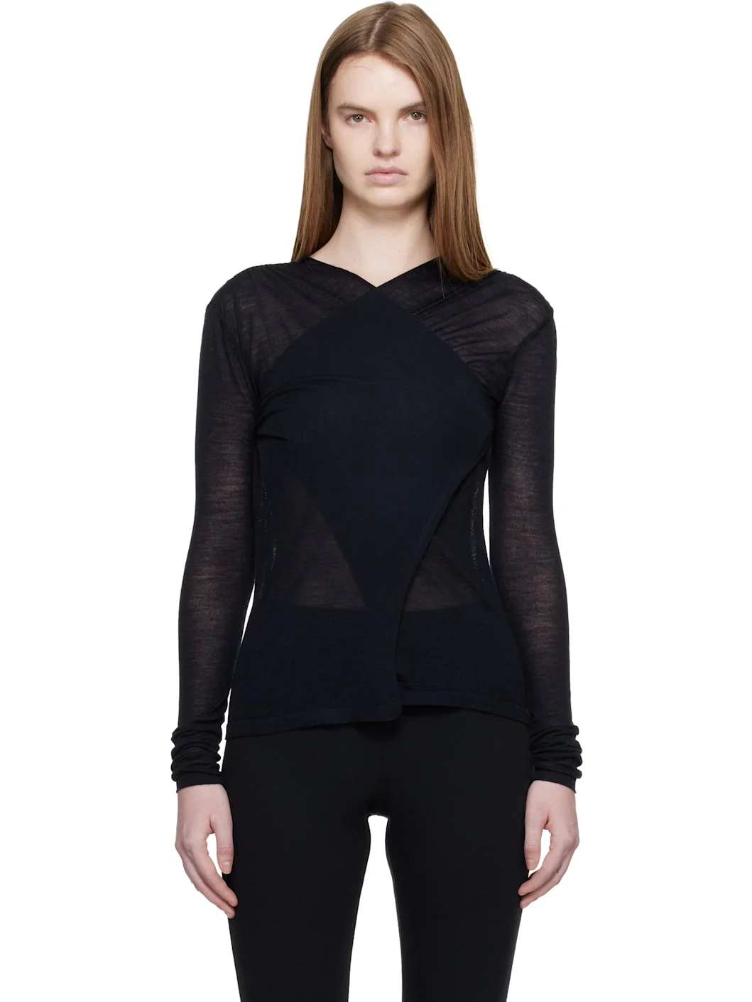 Sheer knit merino wool-blend sweater. · Mulesing-free wool · Wrap construction · V-neck · Ruching at shoulders Supplier color: Black 88% mulesing free merino wool extrafine, 12% polyamide. Made in Spain 261648F100002