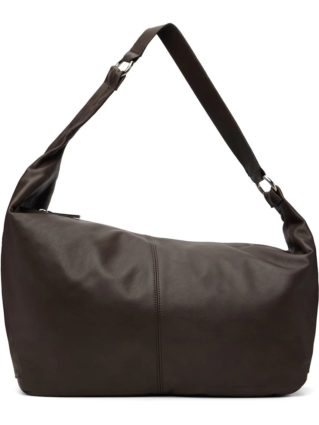Grained leather shoulder bag. · Asymmetrical construction · Hinged rings at adjustable and detachable shoulder strap · Logo embossed at face · Zip closure · Zip pocket and clasp-on-lanyard at interior · Twill lining · Silver-tone hardware · H12.5” x W20.5” x D6” Supplier color: Brown 100% leather. Made in Spain 261648F048006