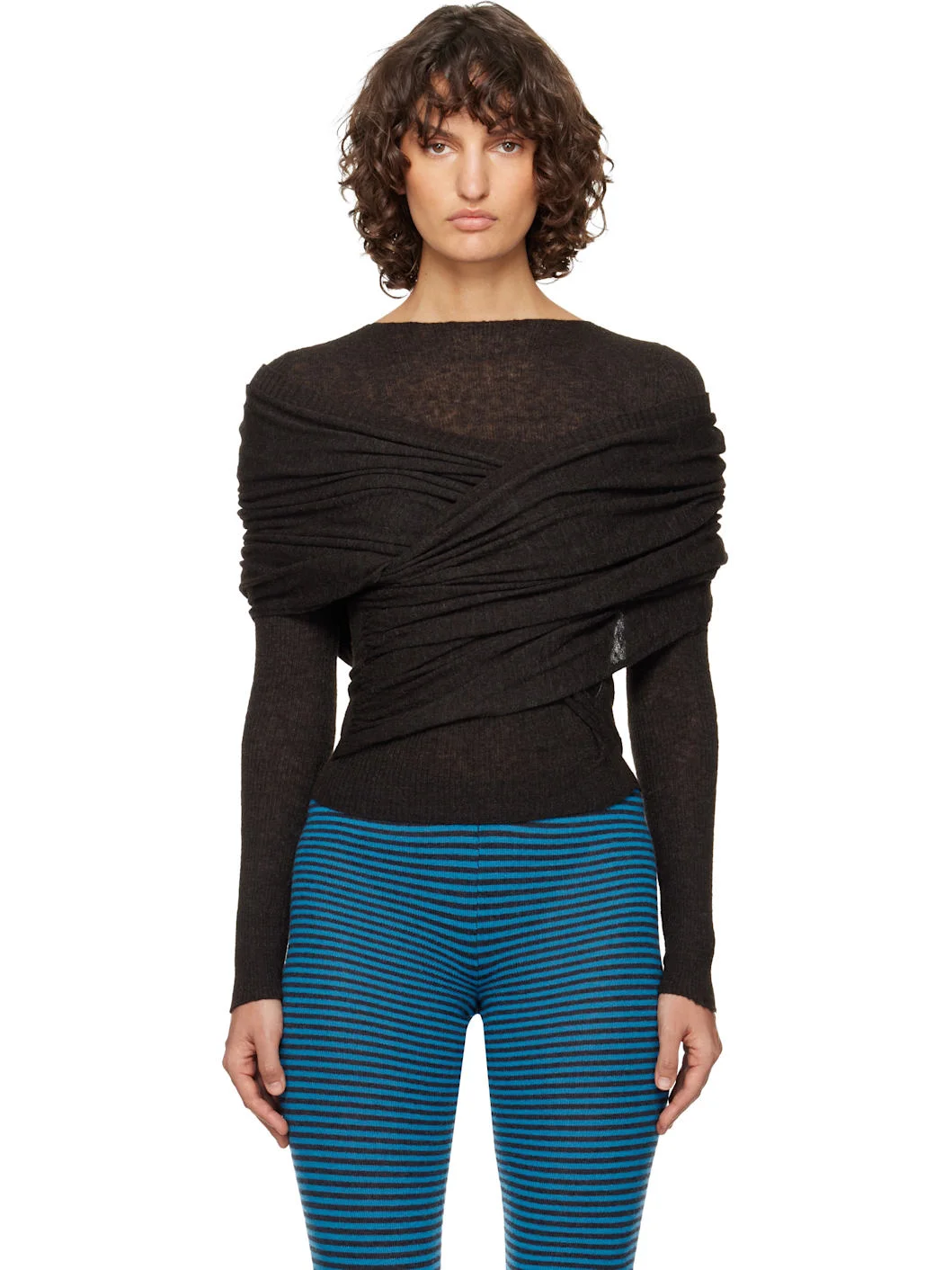 Semi-sheer rib-knit recycled nylon- and baby alpaca-blend sweater. · Layered wrap construction · Draping throughout · Crewneck Supplier color: Brown 43% recycled nylon, 40% baby alpaca, 10% extrafine merino wool, 7% polyamide. Made in Spain 261648F096005