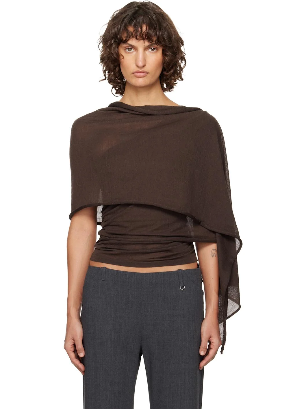 Semi-sheer knit extrafine merino wool-blend blouse. · Mulesing-free wool · Single-shoulder construction · Wraparound panel with alternate neckline at side seam · Self-tie fastening at side seam · Rib-knit hem Supplier color: Brown 88% extrafine merino wool, 12% polyamide. Made in Spain 261648F107000