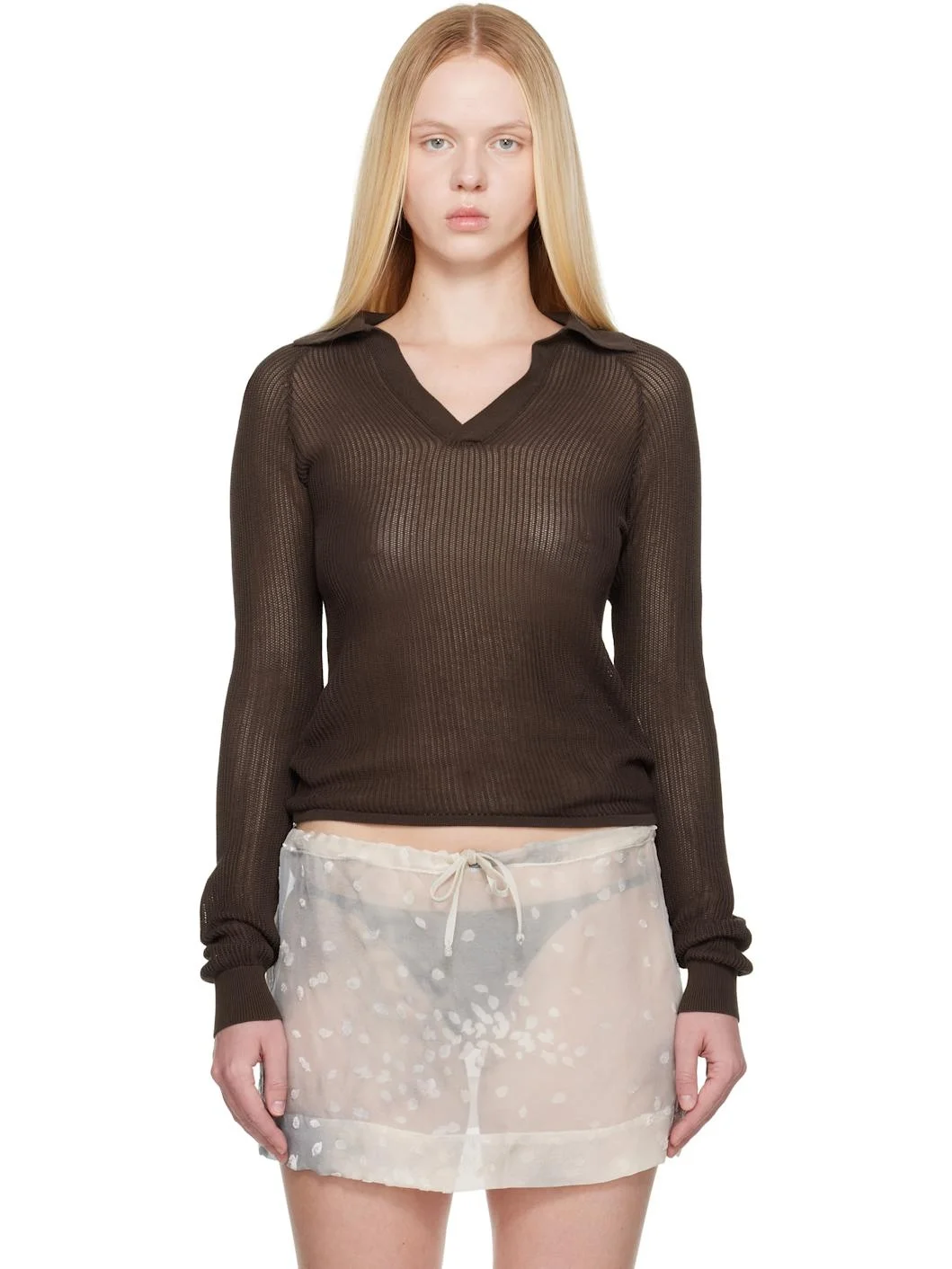 Lightweight semi-sheer rib-knit mako cotton polo. · Spread collar · Open placket · Raglan sleeves Supplier color: Brown 100% mako cotton. Made in Spain 252648F108000