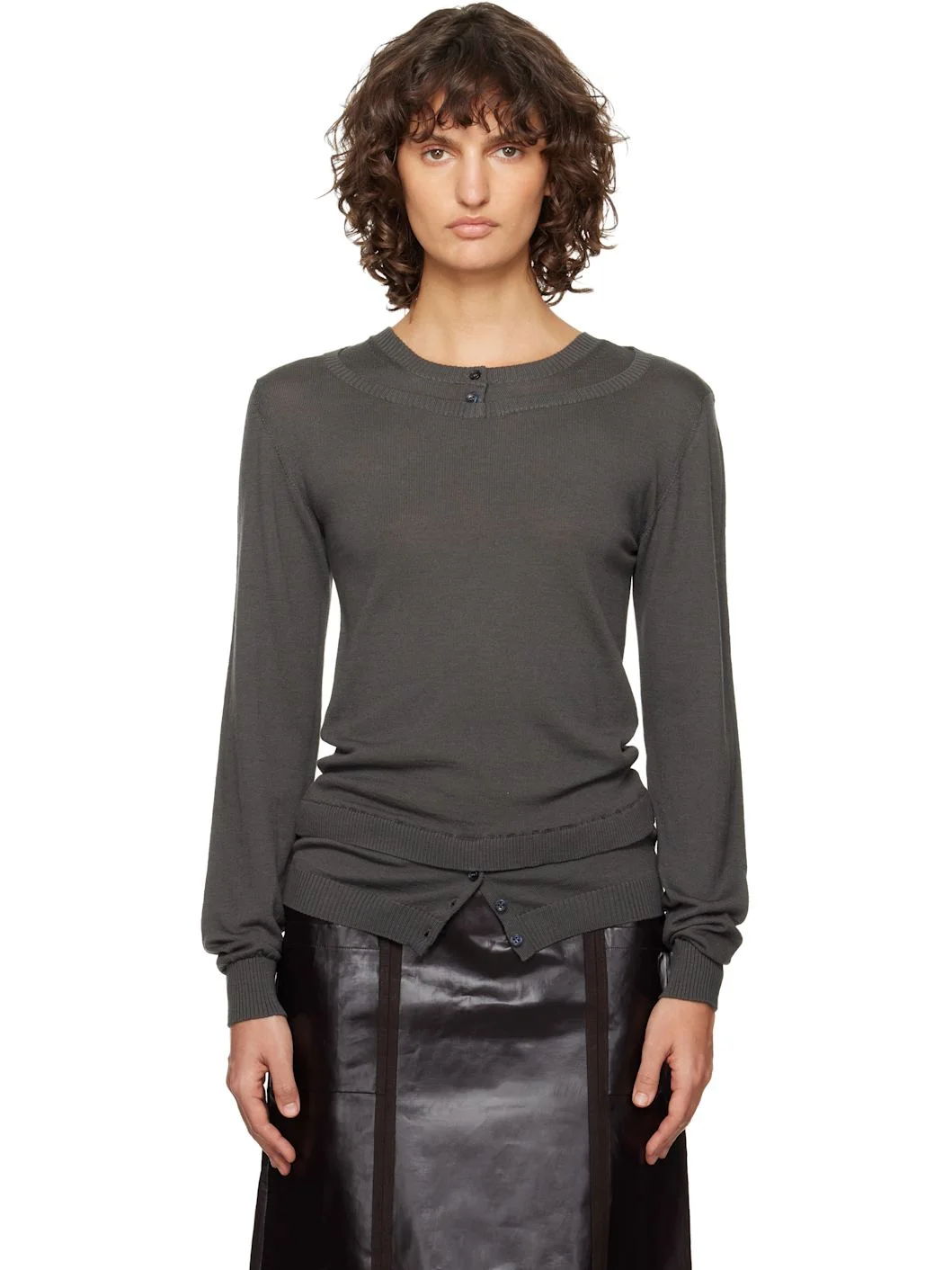 Knit extrafine merino wool sweater. · Mulesing-free merino wool · Two-button placket at crewneck · Layered rib-knit collars and hems · Three-button fastening at hem · Rib-knit cuffs Supplier color: Grey 100% extrafine merino wool. Made in Spain 261648F096008