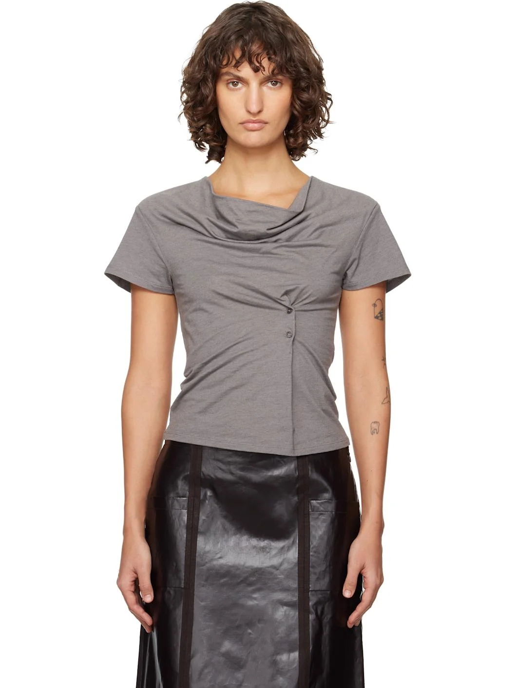 Stretch organic cotton- and wool-blend jersey T-shirt. · Cowl neck · Button fastening at front · Dropped shoulders Supplier color: Grey 75% organic cotton, 19% wool, 6% elastane. Made in Portugal 261648F110007