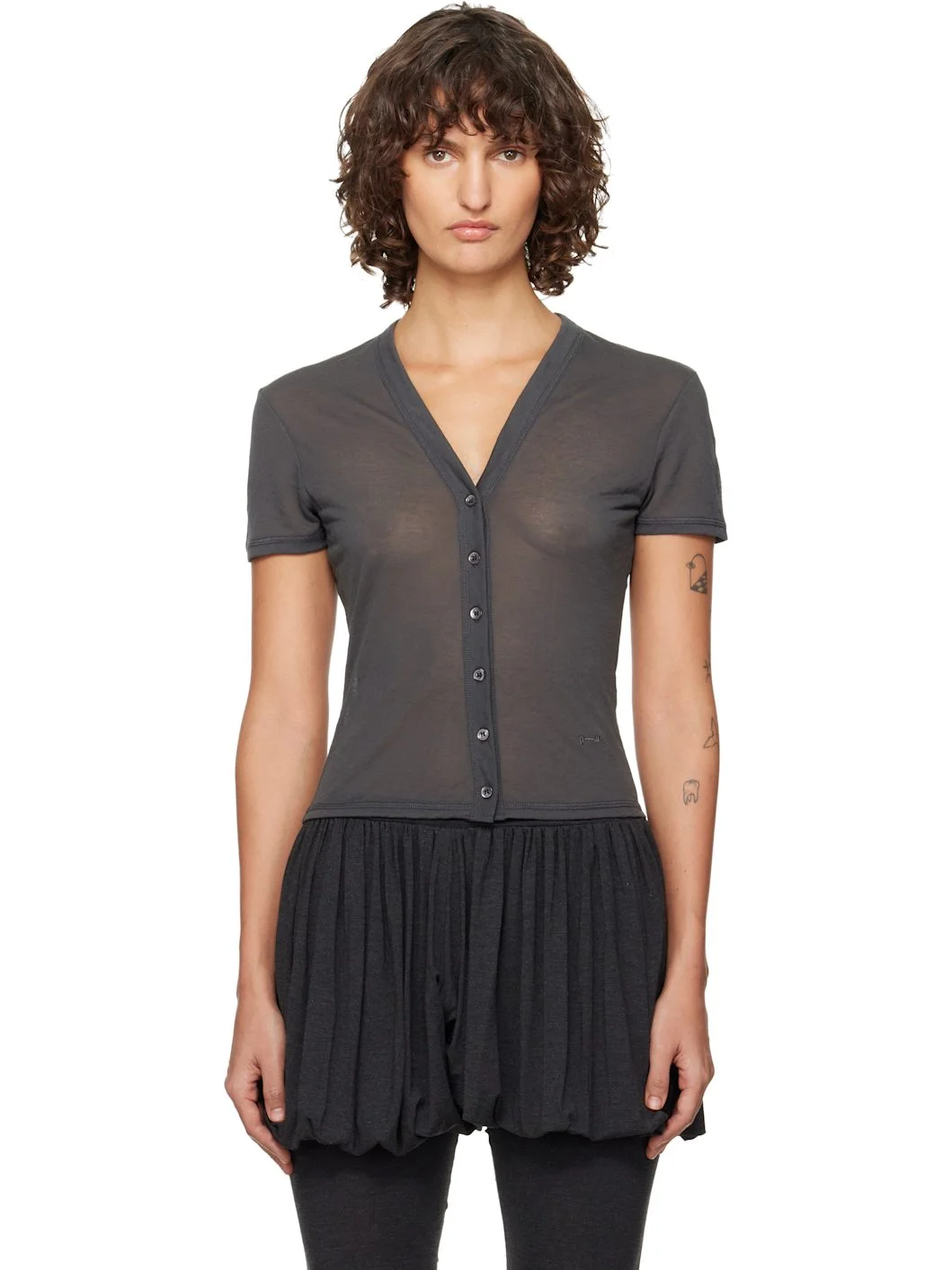 Semi-sheer knit organic cotton-blend T-shirt. · Lightweight · Y-neck · Button closure · Logo embroidered at front · Cropped hem Supplier color: Grey 70% organic cotton, 30% polyamide. Made in Portugal 261648F095014