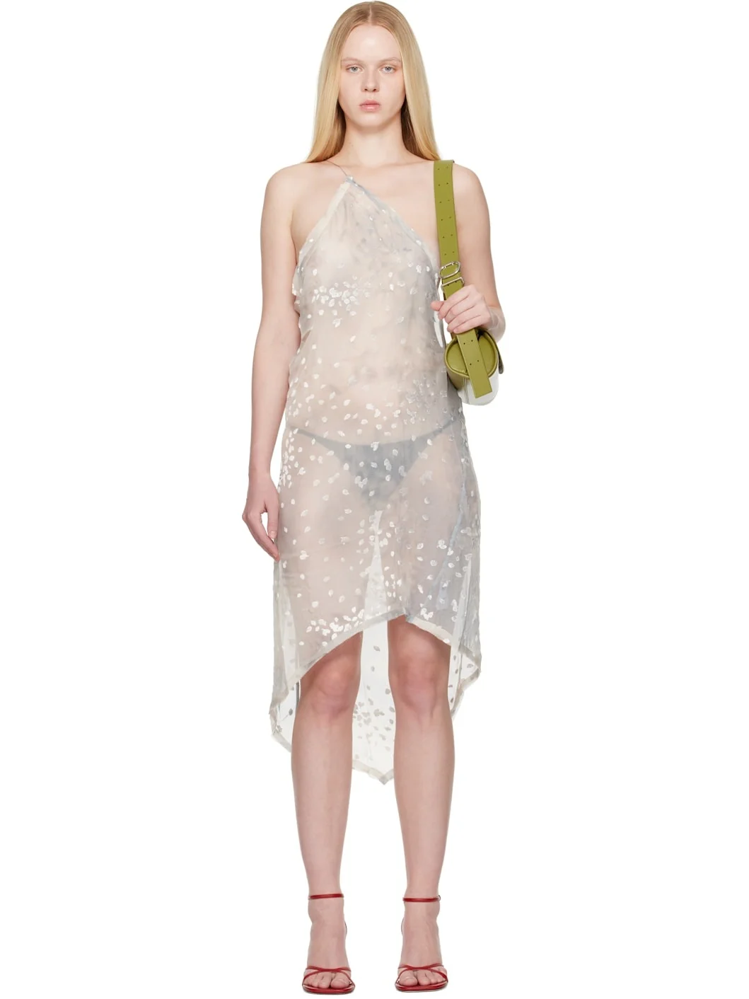 Sheer silk- and viscose-blend chiffon midi dress. Raw edges, flocked graphic pattern, and dyed pattern throughout. · Single-shoulder construction · Asymmetrical hem · Low back Each item is unique. Please note that coloration may vary. Supplier color: Light grey 73% silk, 27% viscose. Made in Spain 252648F054004