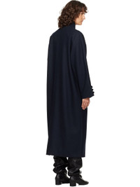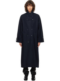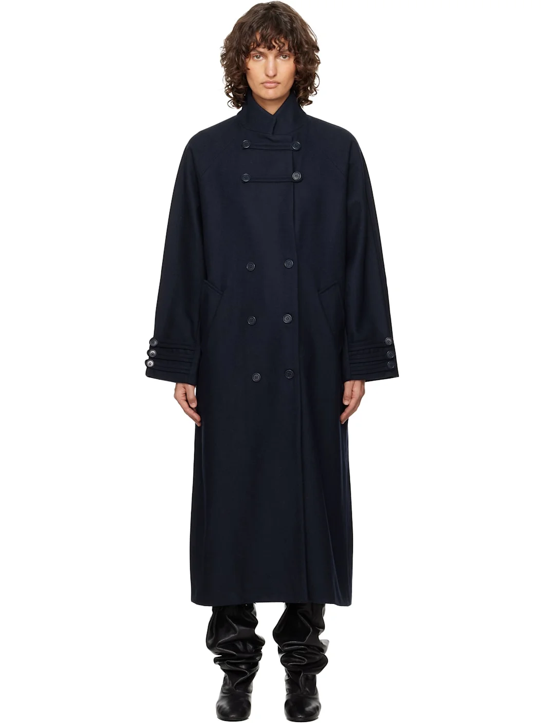 Recycled wool- and recycled cashmere-blend melton coat. · Oversized · Stand collar · Double-breasted button closure · Welt pockets at waist · Raglan sleeves · Buttons at cuffs · Full twill lining Supplier color: Navy 75% recycled wool, 20% recycled polyamide, 5% recycled cashmere. Made in Spain 261648F059000