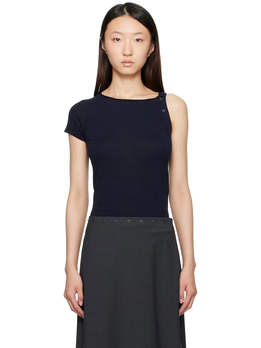 Knit mako cotton top. · Asymmetrical construction · Rolled edge at modified crewneck · Button fastening at shoulder strap Supplier color: Navy 100% mako cotton. Made in Spain 252648F110016