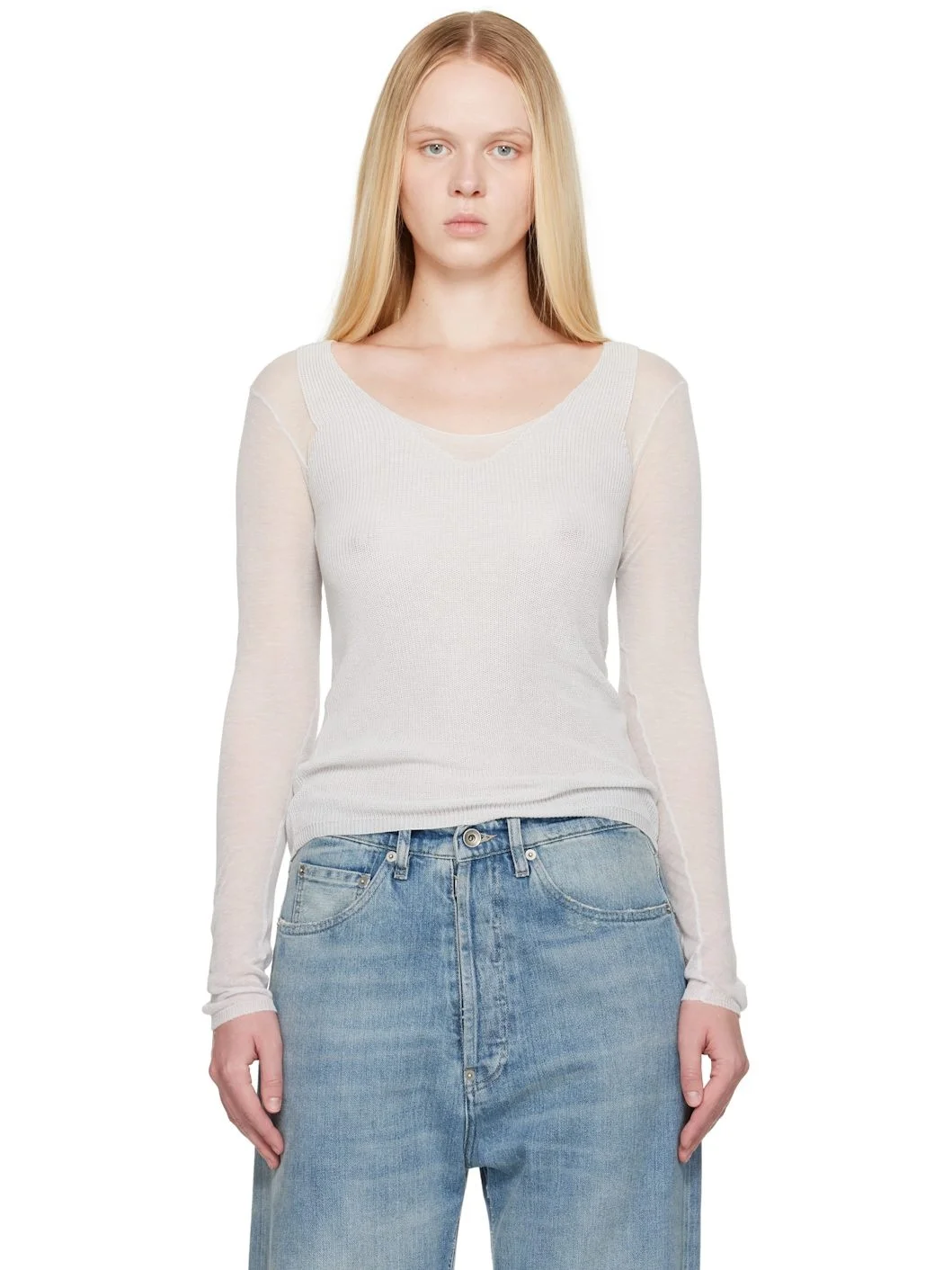 Semi-sheer knit and rib-knit TENCEL™-blend T-shirt. Rolled edge at scoop neck. Supplier color: White 87% tencel lyocell, 13% polyamide. Made in Spain 252648F110021