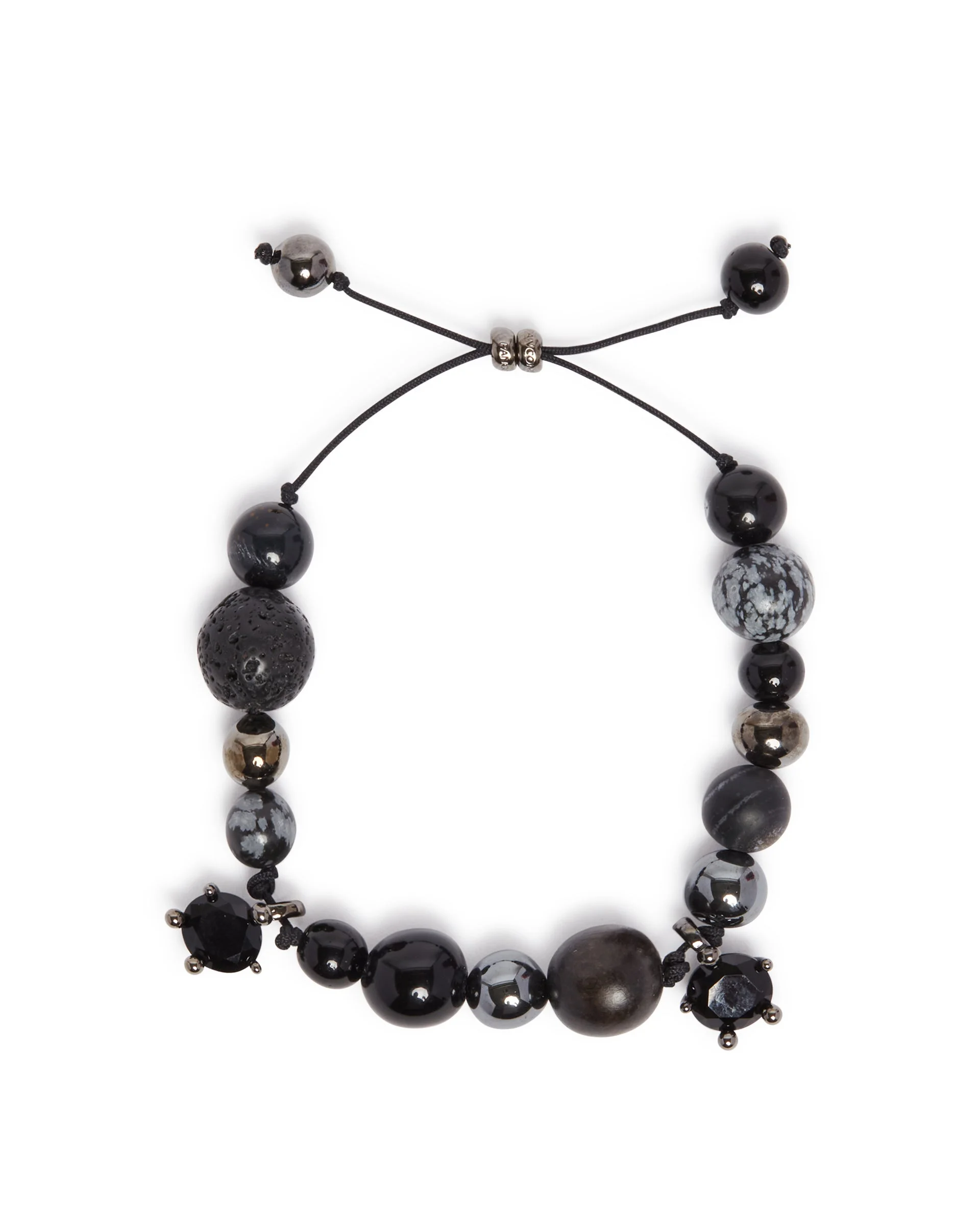 Panconesi Night Sky Necklace. Asymmetrical design with black cord base, rhodium-plated brass, and multiple stones such as black obsidian, zircon, lava, and black onyx. Part of the Ascolto Family collection. DETAILS Model: F25WR006SBLACK Composition: 50% Brass, 50% Stones; String: 100% Nylon Made in: ITALY Season: FW25-26