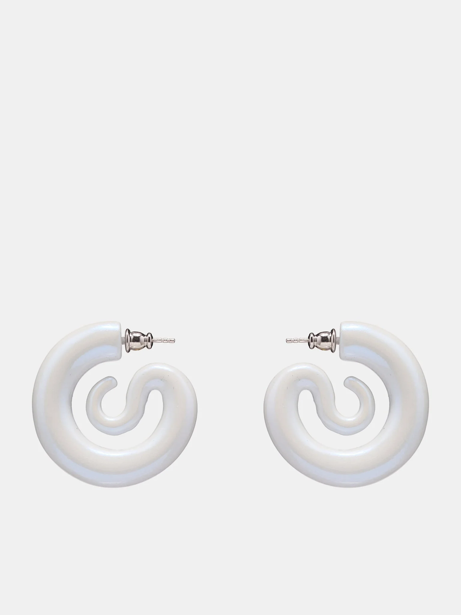 PANCONESI earrings in white, signature serpent design, rhodium plated copper, pearl enameled finish, post-stud fastening. Made in Italy 100% Copper, Rhodium, Enamel Diameter - 1.5" Weight - 7 grams