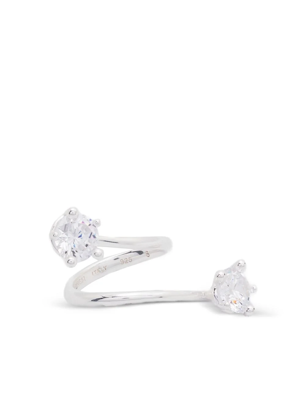 spiral sterling silver ring Highlights - Silver-tone - Sterling silver - Spiral design - Two cubic zirconia stones - Claw setting - Open band Imported SIZE & FIT Measurement Band Width 0.11 in(0.3 cm) CIRCUMFERENCE 20.07 in(51 cm) Feature Length 1.57 in(4 cm) Feature Width 0.39 in(1 cm)