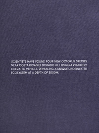 THIS T-SHIRT IS MADE FROM 100% ORGANIC COTTON, THE PRINT IS DYED WITH NATURE COATINGS BIOBLACK TX™, AN ALTERNATIVE TO PETROLEUM-DERIVED CARBON BLACK MADE FROM FSC CERTIFIED WOOD WASTE. THIS PIECE CELEBRATES THE STORY BEHIND THE DISCOVERY OF FOUR NEW OCTOPUS SPECIES NEAR COSTA RICA'S EL DORADO HILL. USING A REMOTELY OPERATED VEHICLE, RESEARCHERS FOUND TWO HYDROTHERMAL SPRINGS AND NURSENES FOR OCTOPUSES, REVEALING A UNIQUE UNDERWATER ECOSYSTEM AT A DEPTH OF 3,000 METERS. BROODING MOTHERS STRATEGICALLY CHOSE LOCATIONS NEAR HYDROTHERAL VENTS TO ENHANCE OFFSPRING SURVIVAL. THIS DISCOVERY SHOWS THE IMPORTANCE OF INTERNATIONAL COLLABORATION IN DEEP SEA RESEARCH AND CONSERVATION EFFORTS. BY WEARING THIS T-SHIRT YOU ARE SPREADING THE POSITIVE NEWS AND GENERATING HOPE.