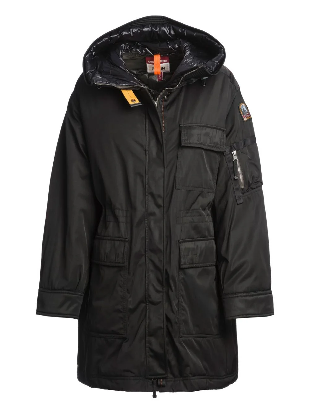 hooded pocket jacket Highlights - Black - Drawstring hood - Multiple pockets - Long sleeves - Zip fastening Imported Composition Outer: Polyester 65%, Cotton 35% Lining: Recycled Polyamide 100%, Duck Down 90%, Duck Feathers 10% Washing instructions Read Manufacturer Guidelines