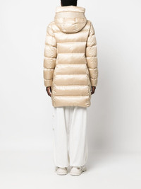 Marion quilted hooded jacket Highlights - Light beige - Down-feather filling - Padded design - Quilted - Classic hood - High neck - Throat latch - Front two-way zip fastening - Long sleeves - Logo patch at the sleeve - Elasticated cuffs - Two zip-fastening pockets - Straight hem - Thigh-length Imported Composition Outer: Polyester 60%, Polyamide 40% Lining: Polyamide 100%, Duck Down 100% SIZE & FIT Model measurements Height 5 ft 10 in(1.77 m) Bust/Chest 32.28 in(82 cm) Hips 35.03 in(89 cm) Waist 25.19 in(64 cm) FittingInformation Designed for a slim fit that sits just away from the body offering a close yet comfortable fit Made from a padded non-stretch fabric, giving it no natural elasticity This piece fits true to size – take your usual size