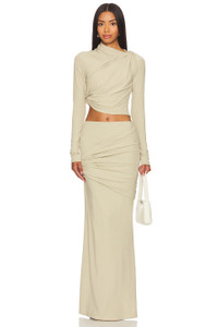 - Shell 1: 100% polyester Shell 2: 50% nylon 40% cotton 10% elastane Lining: 95% polyester 5% elastane - Made in China - Dry clean only - Fully lined - Item not sold as set - Skirt measures approx 44" in length - Revolve Style No. PGEO-WQ8 - Manufacturer Style No. ARIS001